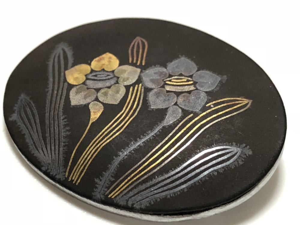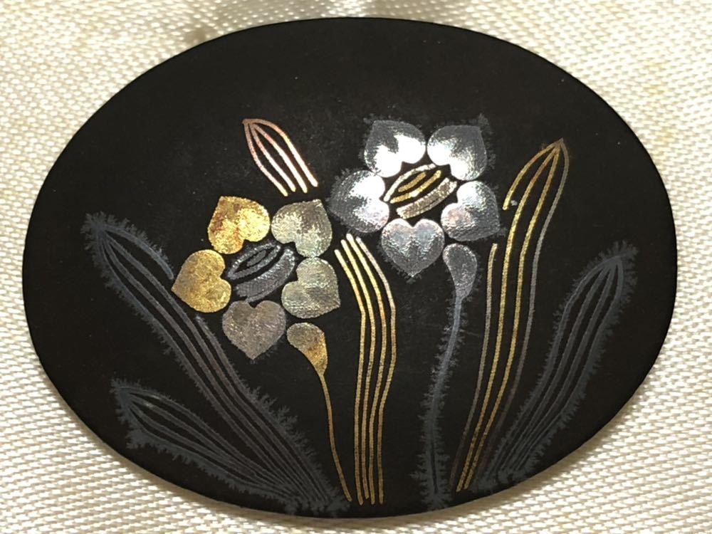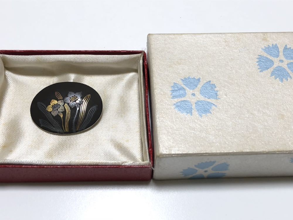 純金銀象嵌を使用した、水仙細工のブローチです。象嵌部分に変色、裏の金属面に小キズがあります。共箱付属です。