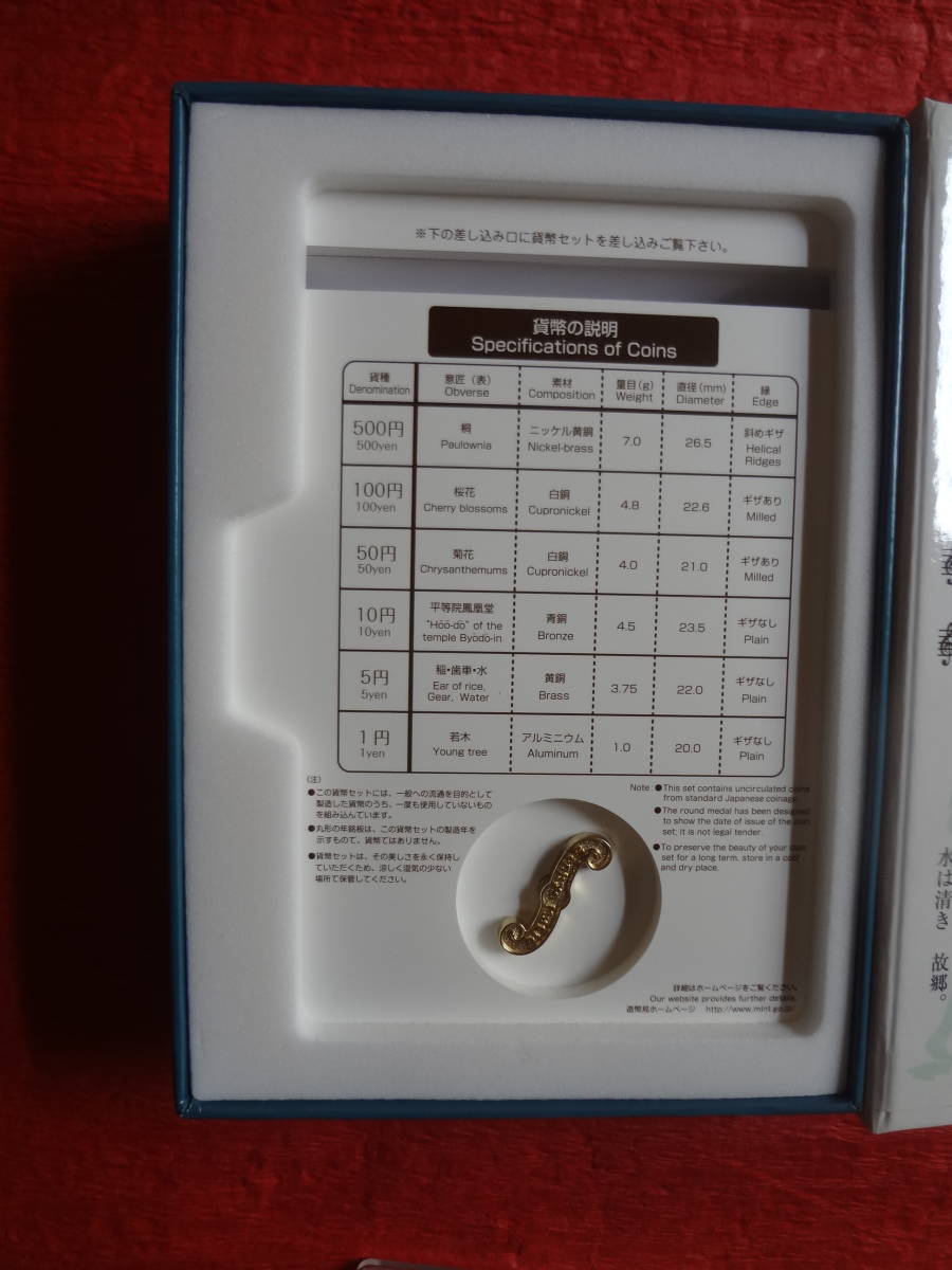 セットには、童謡「故郷(ふるさと)からイメージしデザインした丹銅製年銘板と、平成21年銘の未使用の5百円から1円までの6種類の通常貨幣をプラスチックケースに組み込み、ブック型ケースに収納しています。