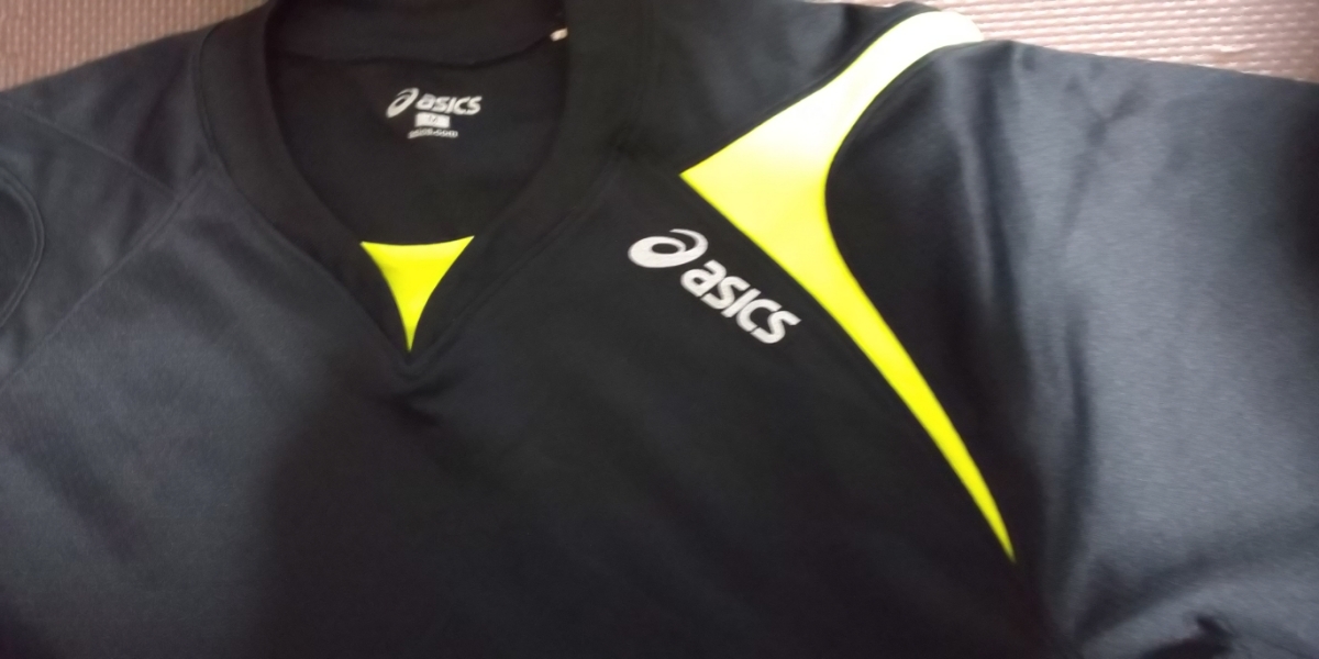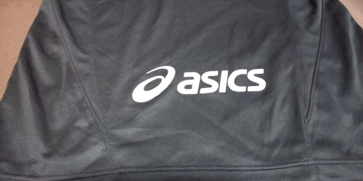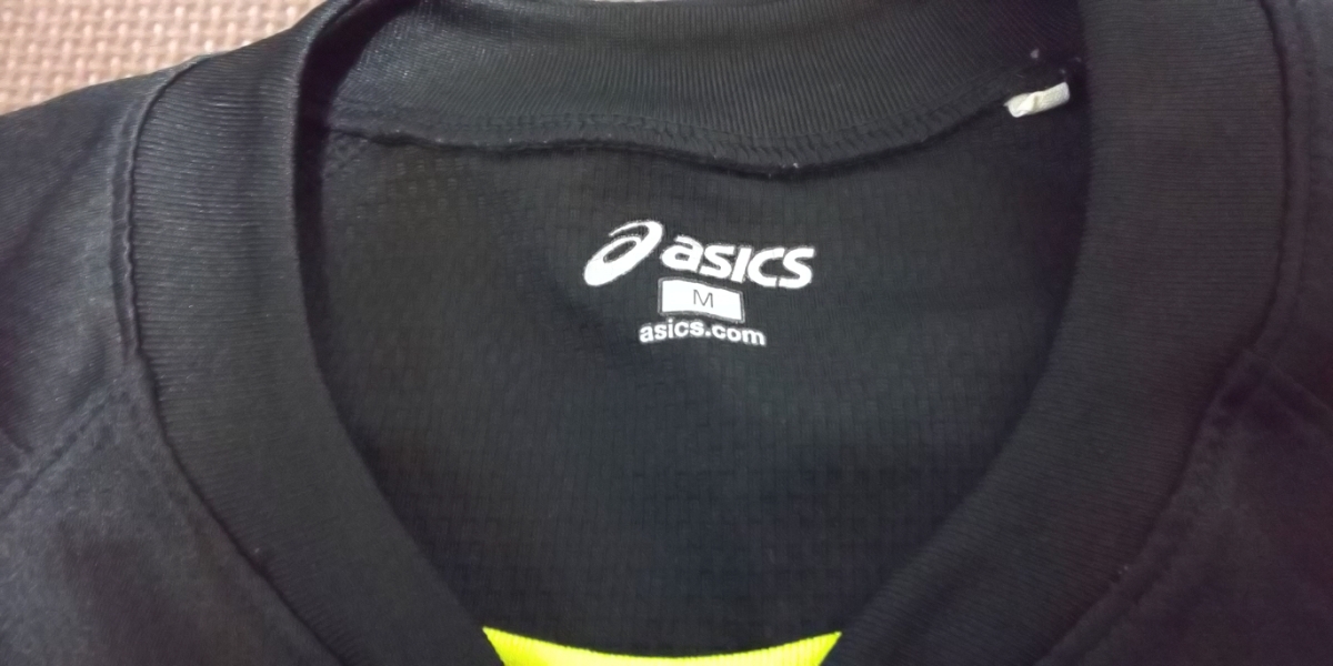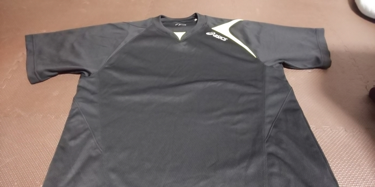 美品ASICS黒、蛍光色、半袖ストレッチトップス