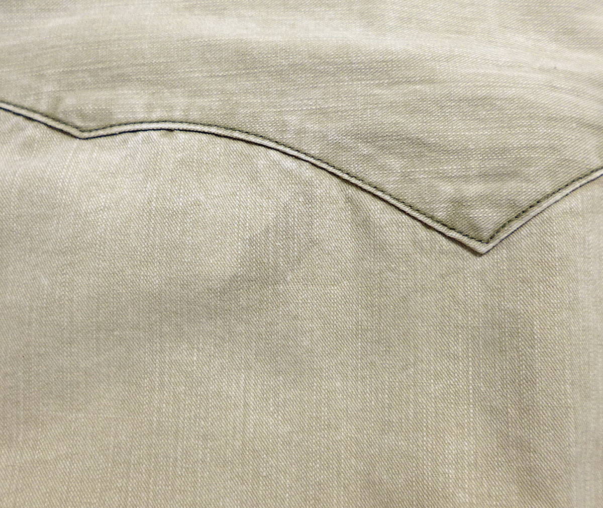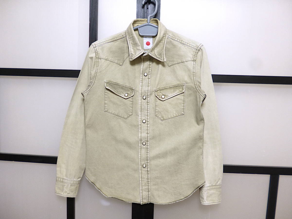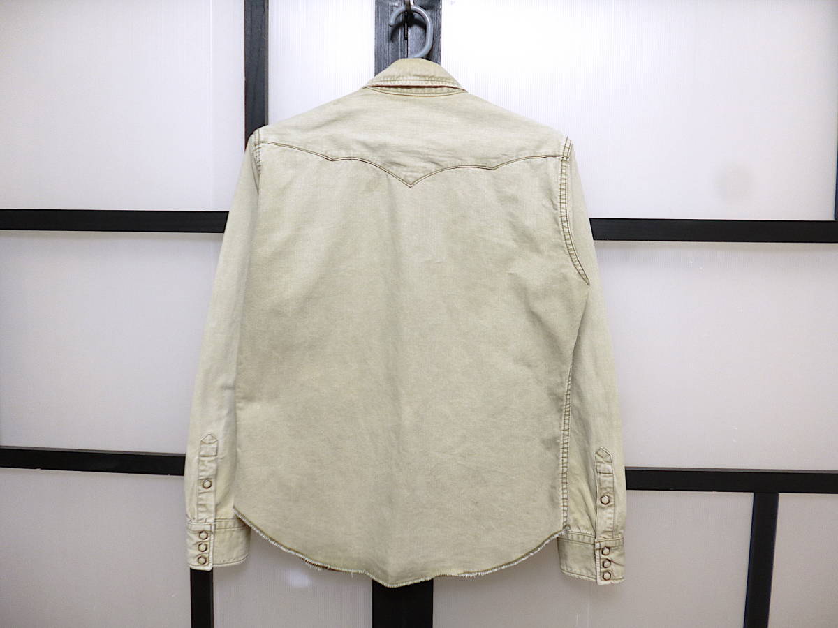 | コメント | 全体的なデザインはウエスタンタイプで、エリはレギュラーカラー、スソはラウンド、ポケットは両ムネに付いています。ボタンは全てスナップボタンを使用。全体的に色落ち加工や、エリの色落ち加工、袖口の擦り傷、シミなど、古着風の加工がされています。他にも色々なブランドのデニムシャツやウエスタンシャツ、その他いろいろなアイテムを出品しています。よろしければご覧ください。 |