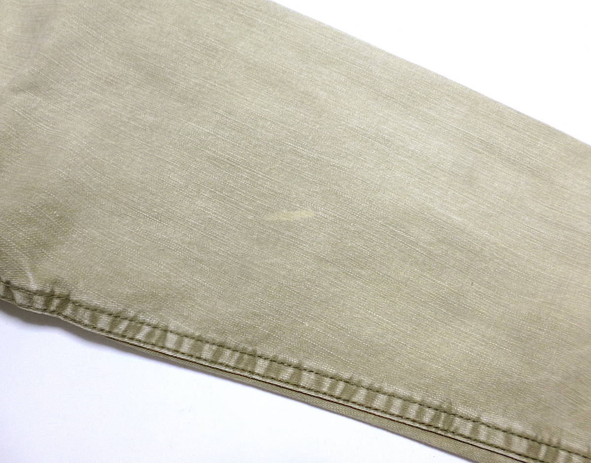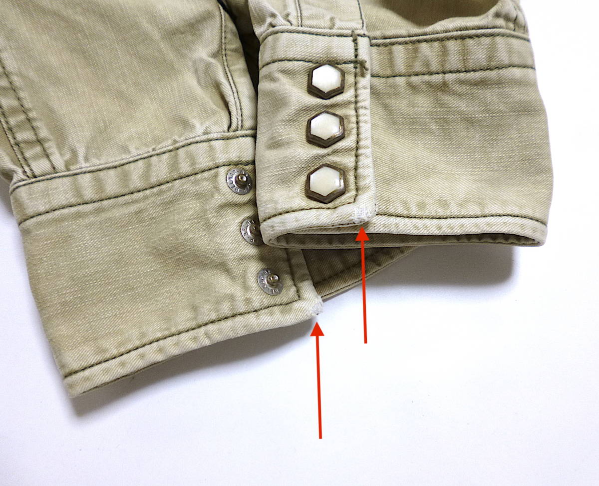 | コンディション | 全体的な色落ちやエリの色落ち、袖口の擦り傷やシミなどありますが、これはあえて加工されて施されたものと思われます。予めご了承ください。全体的には着用感は多少ありますが、着用に支障の有るダメージ等は無く、まずまず良好だと思います。中古に理解の有る方のみ入札して下さい。 |