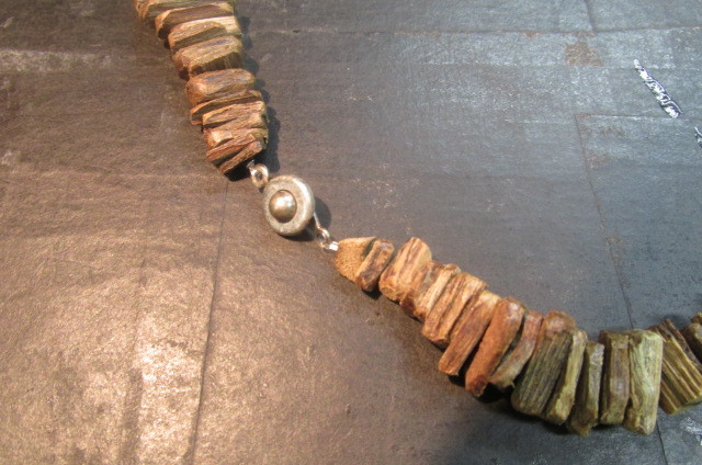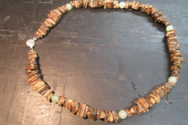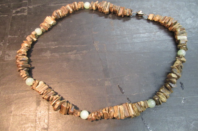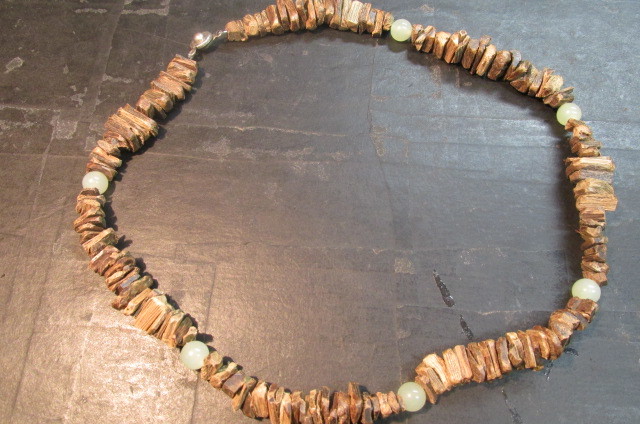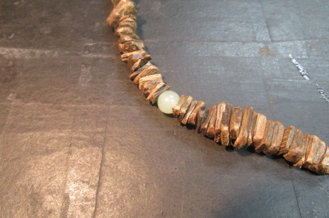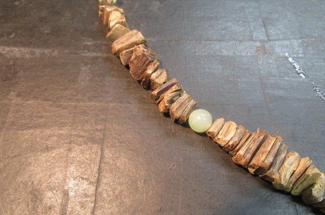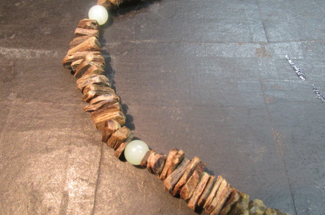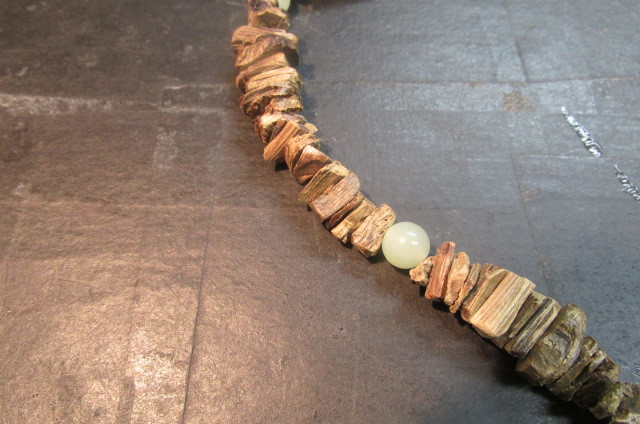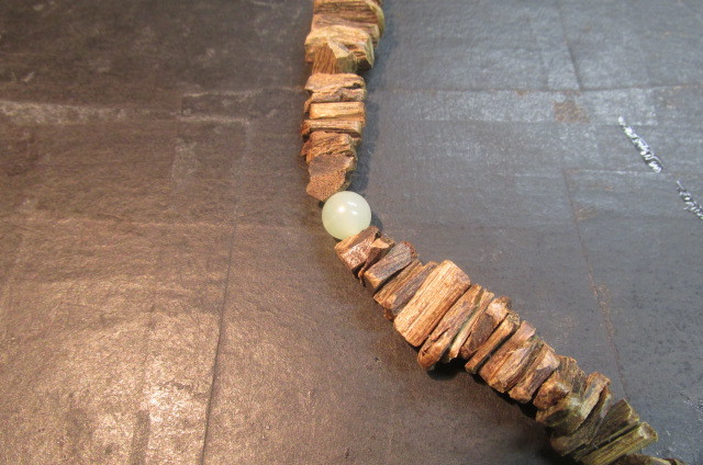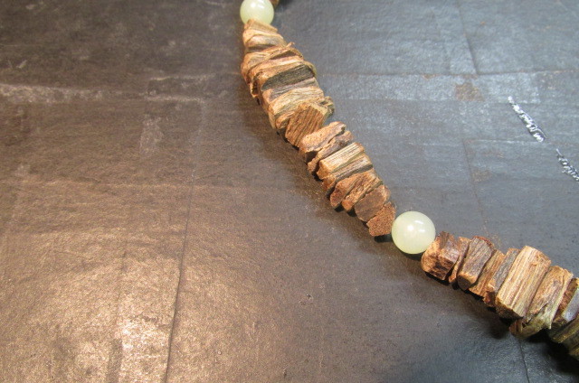 沈香を色々な長方形に割って板状にした物を丹念に連ねていきアクセントに玉(ギョク)の玉を挟んでえもいわれぬ芳しい香りのネックレスを作ってみました。見栄えは全くと言っていいほどしませんが香りはこれ以上の物はないと言えるほどの芳しい香りがします。一度試してみてはいかがでしょう。