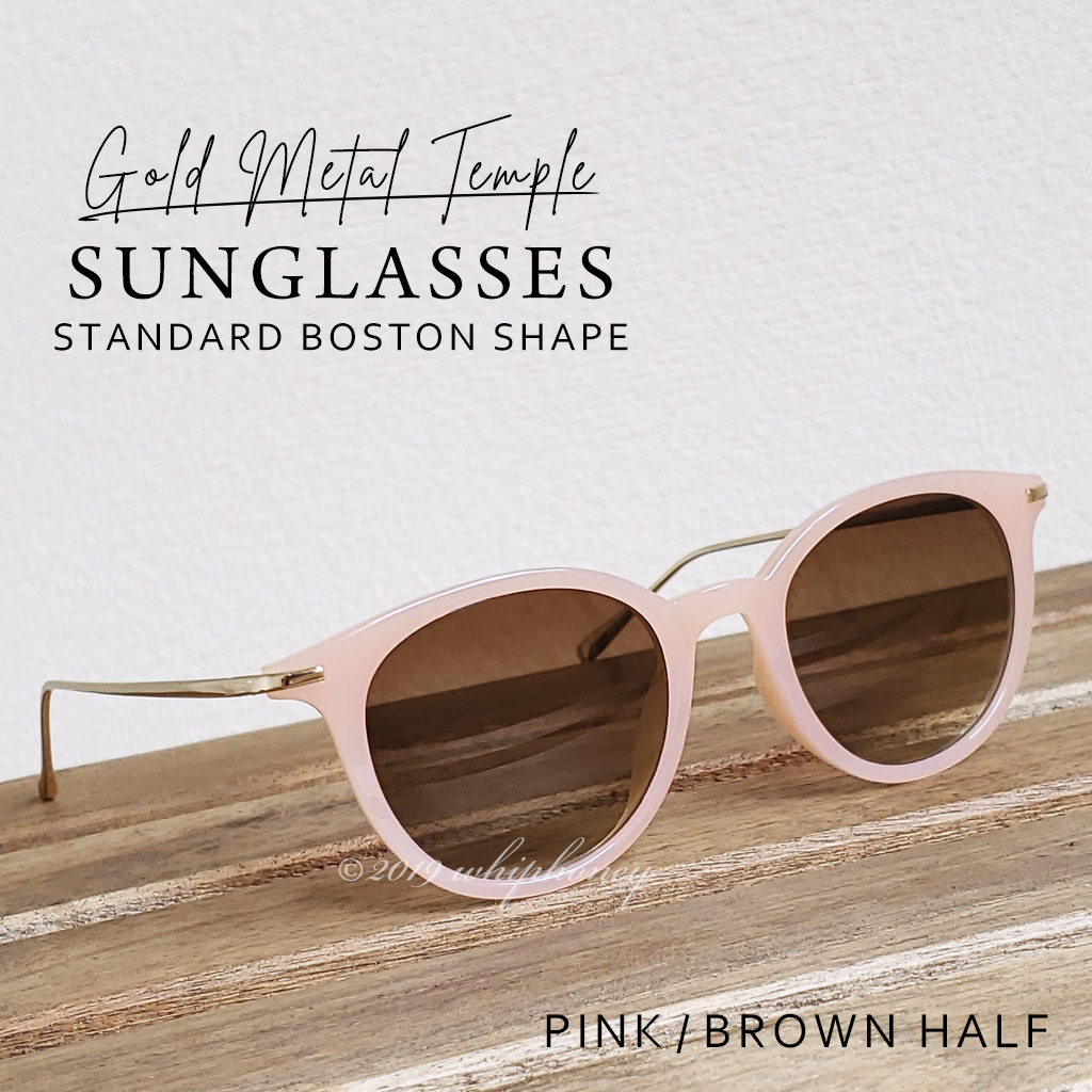 送料無料 ボストンUVシアーサングラス ゴールドメタルテンプル ベージュピンク ブラウン 伊達メガネ