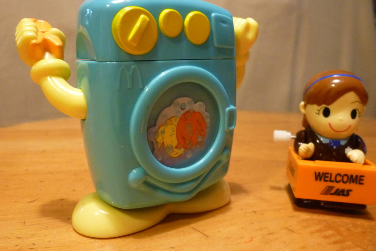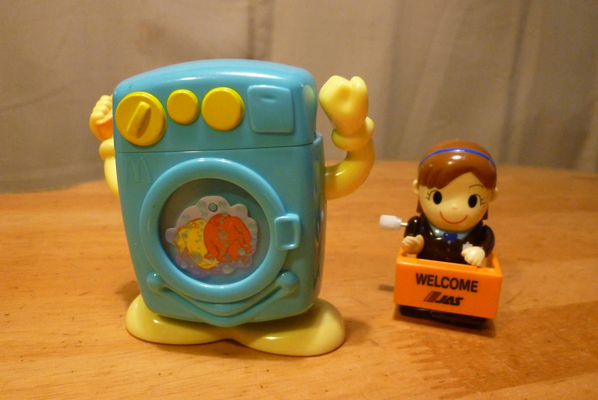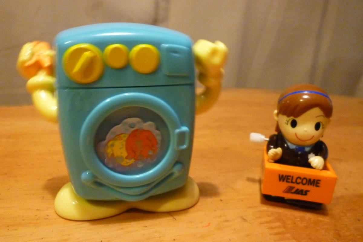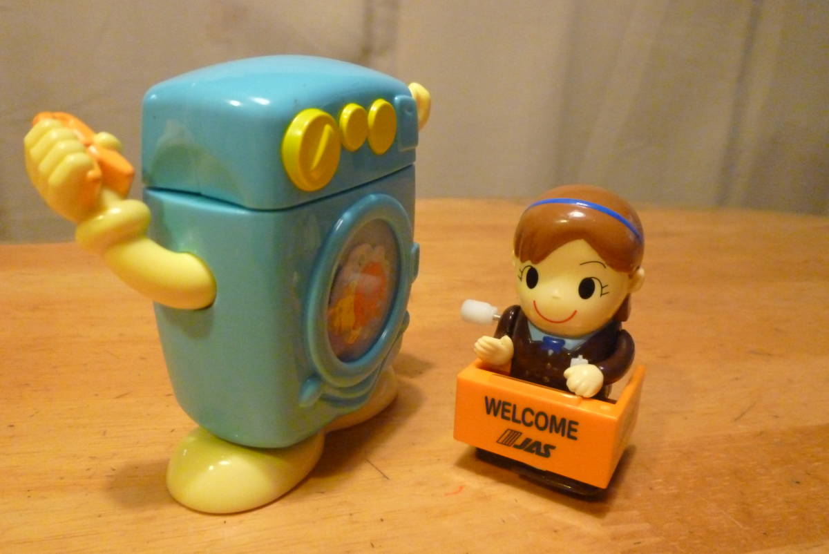 こちらはマクドナルドの景品で、エアーの力で本体が左右にカタカタと動く洗濯機と他社製でJAS(JALでは無く)名称のゼンマイ式のキャビンアテンダント?スタイルの同様に動くおもちゃのセットになります。洗濯機は本体のこぶしより上の部分が引き上げられ、その部分を上下させると少し動きが重くなりエァーが入った状態になりますのでそのまま床に置くと両足を踏ん張って本体を左右に細かく動かし中の洗濯物が洗われる省力化最先端の見本の様なものだと思います。ゼンマイ式はおなじみ巻いて離すと両足を交互に動かし少し前へ進みます。