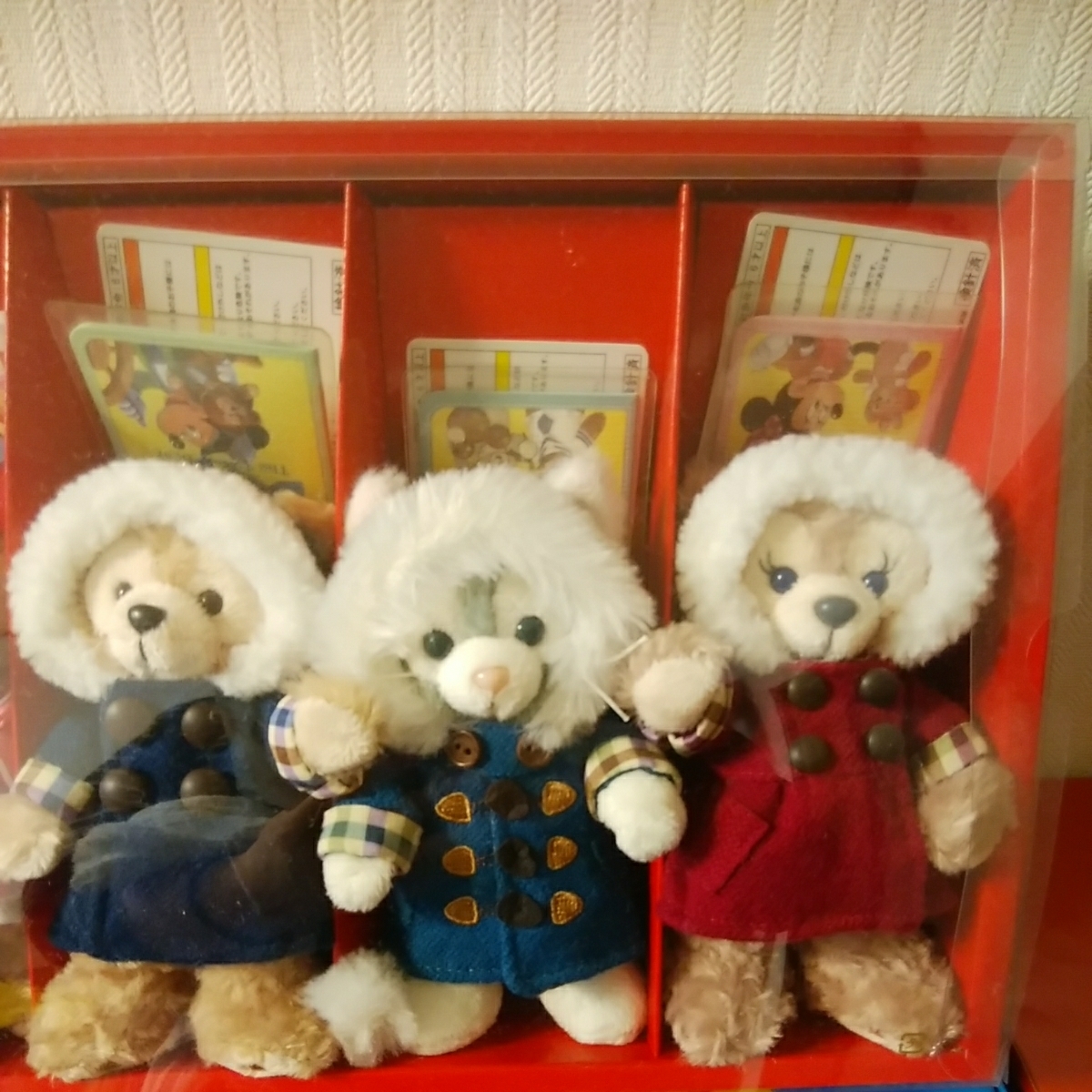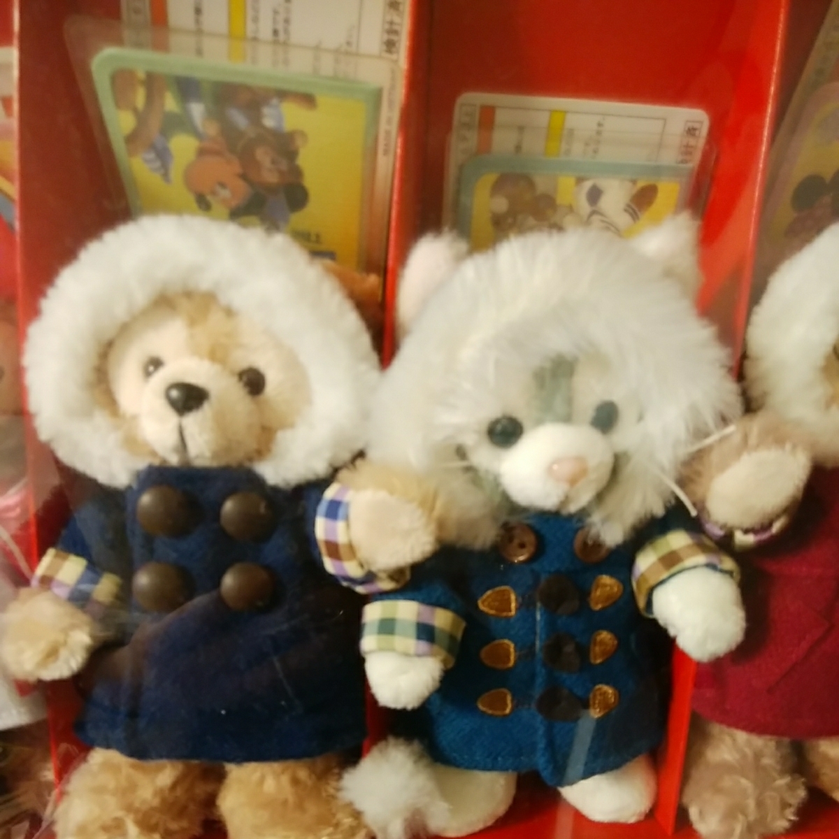 ダッフィー、シェリーメイ、ジェラトーニのダッフルコートのぬいば(ヌイバ)ですが、同じ物があるので出品しますが、値引き不可です。又、埃防止のために、ケースに入れて、保管していたので、綺麗な状態かとは思いますが、神経質な方はお控え下さい!尚、セットでの出品なので、単品出品はしていませんし、ケースは付きません!