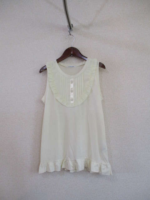 商品紹介 | 胸元にシフォン素材が使われたノースリーブです。 本体はカットソー素材です。 胸元のピンタックと縁と裾のフリルがカワイイです。 色はきなりです。 《素材》 本体:ポリエステル65% レーヨン35% 別布:ポリエステル100% |