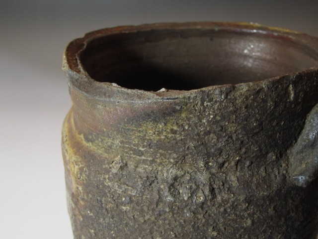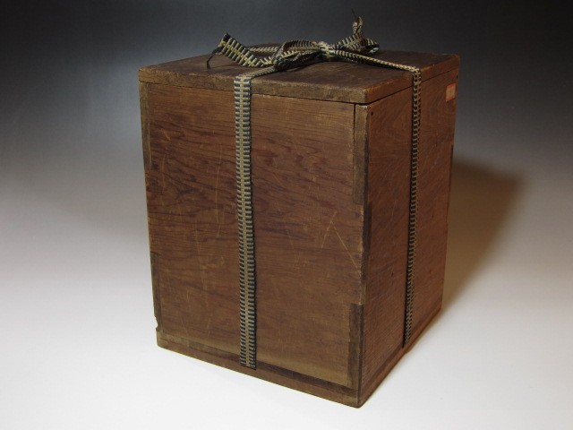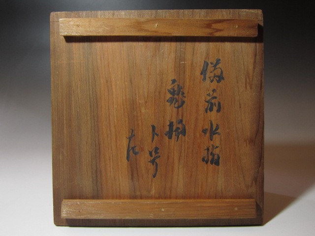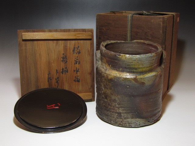 特徴:古い備前の味わい深い土味の品です。 時代の塗り蓋と箱には、表千家九代 了々斎の花押があります。 寸法:直径15㎝×高さ15㎝ 状態:口に古いキズが見られますが、一つの景色ともみえ時代に迫力を増しています。 その他、ヒビや水漏れはありません。 | ||