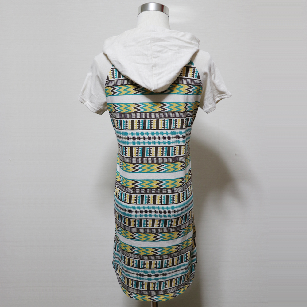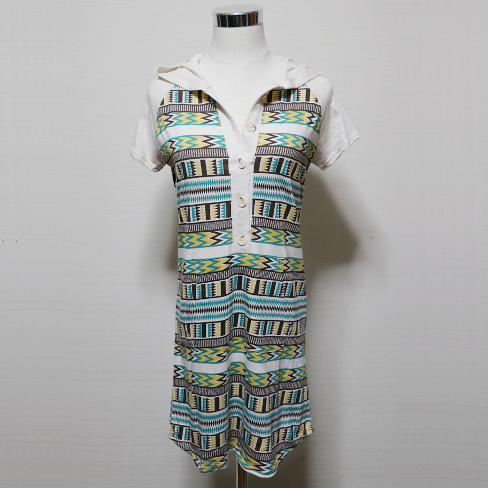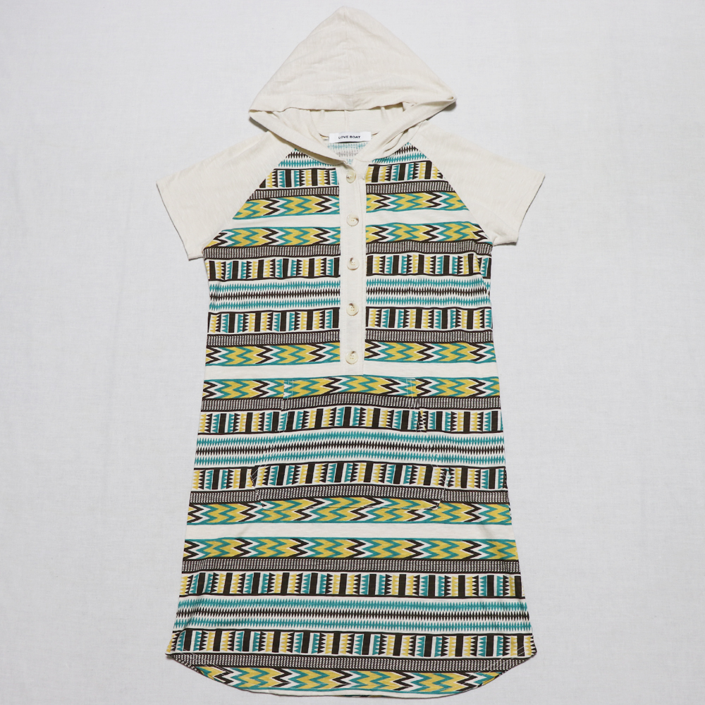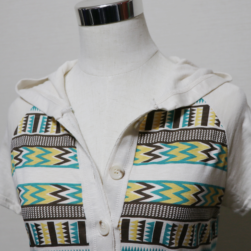 レトロ感のあるエスニック柄の切り替えに前ボタンとフードの組み合わせがとても素敵です。