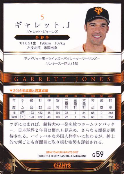 BBM 読売ジャイアンツ ベースボールカード2017 G59 ギャレット 巨人 アメリカ