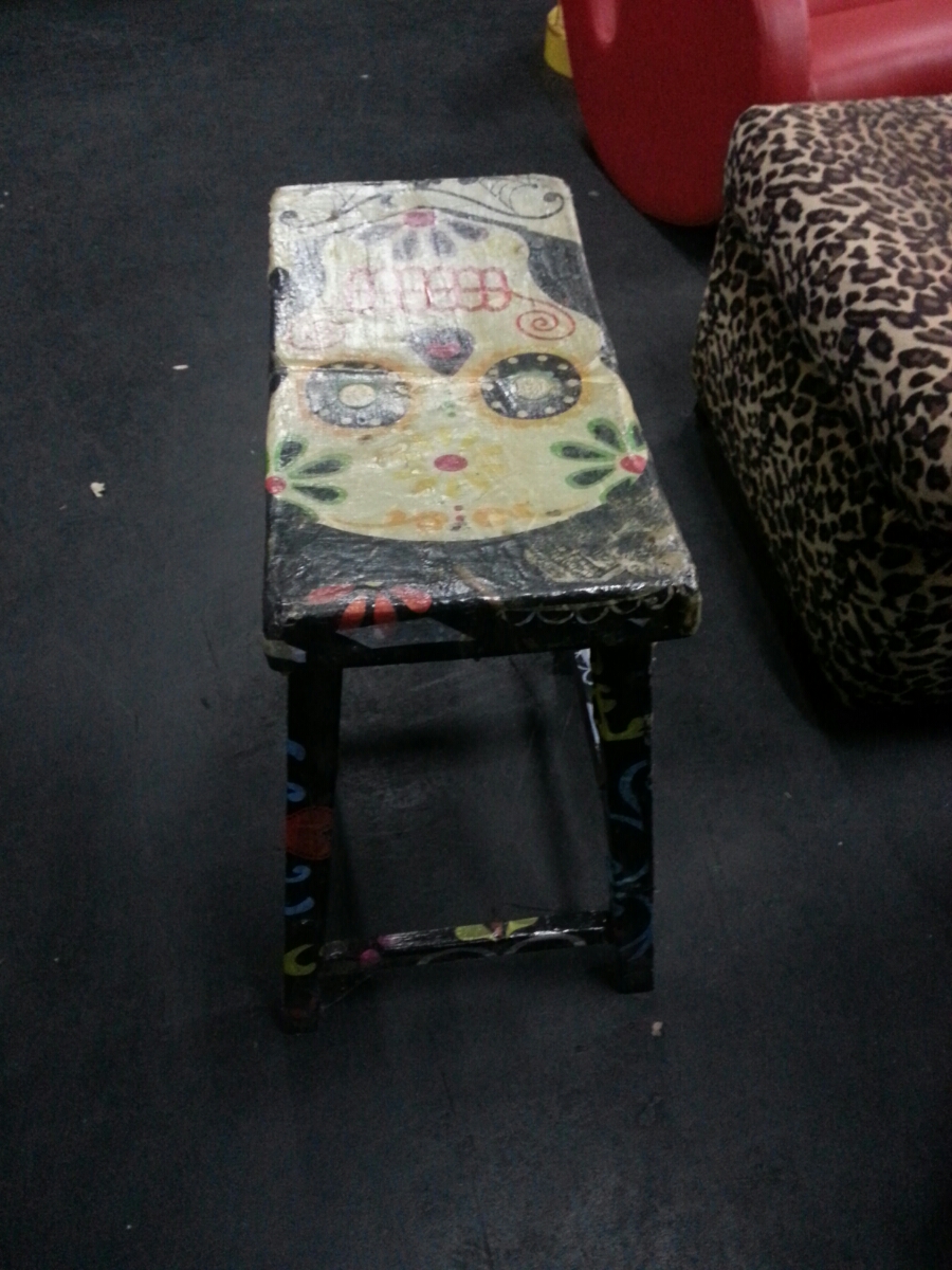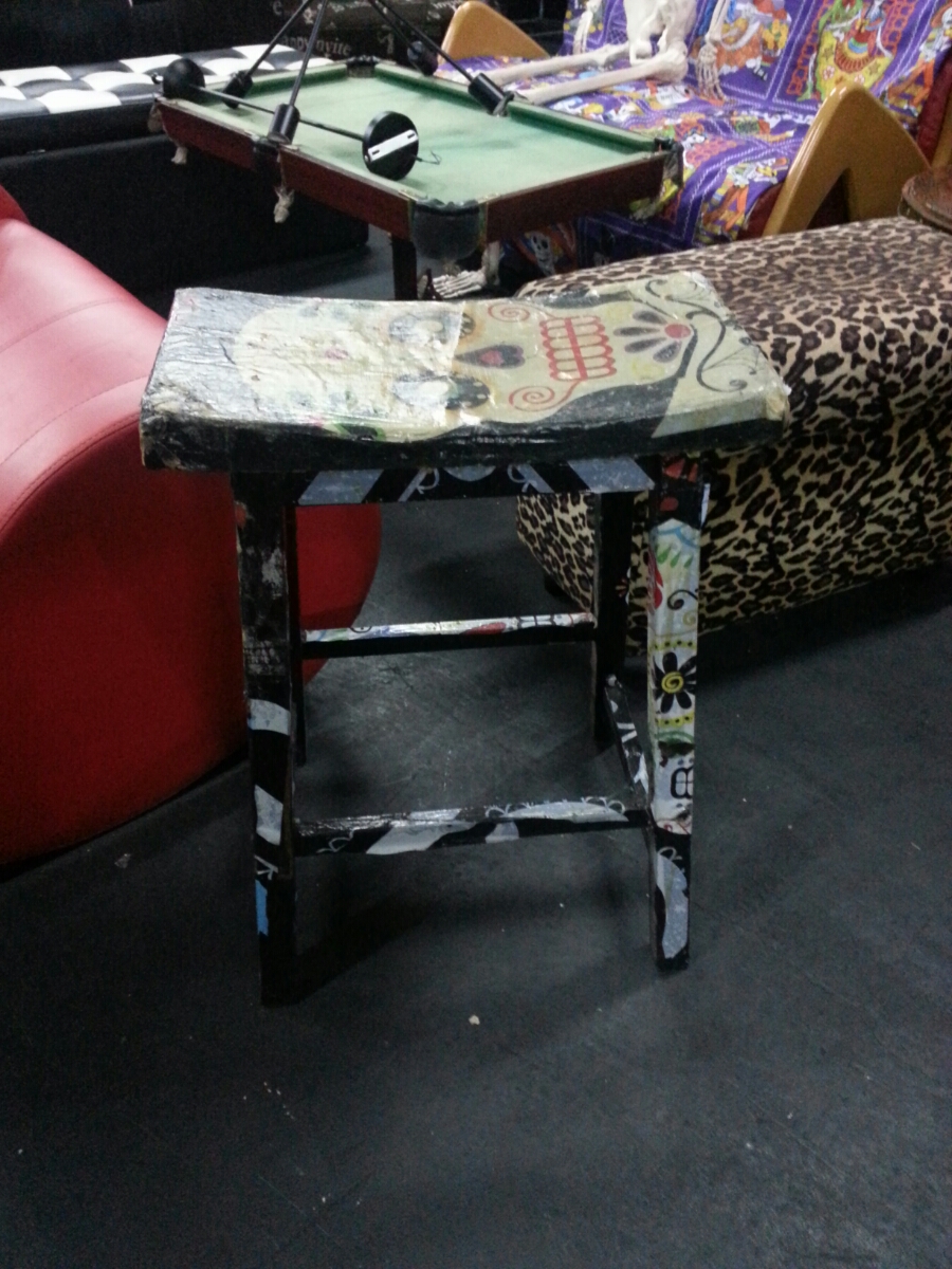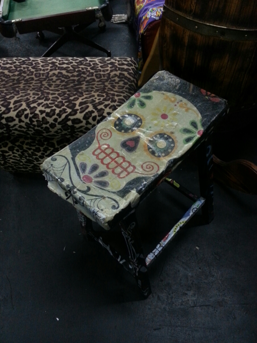 ニューメキシコのアンティークショップにて購入した物で木製の椅子に蝋でスカルデザインを貼り固めた作りが独特の雰囲気あるオシャレな一品です