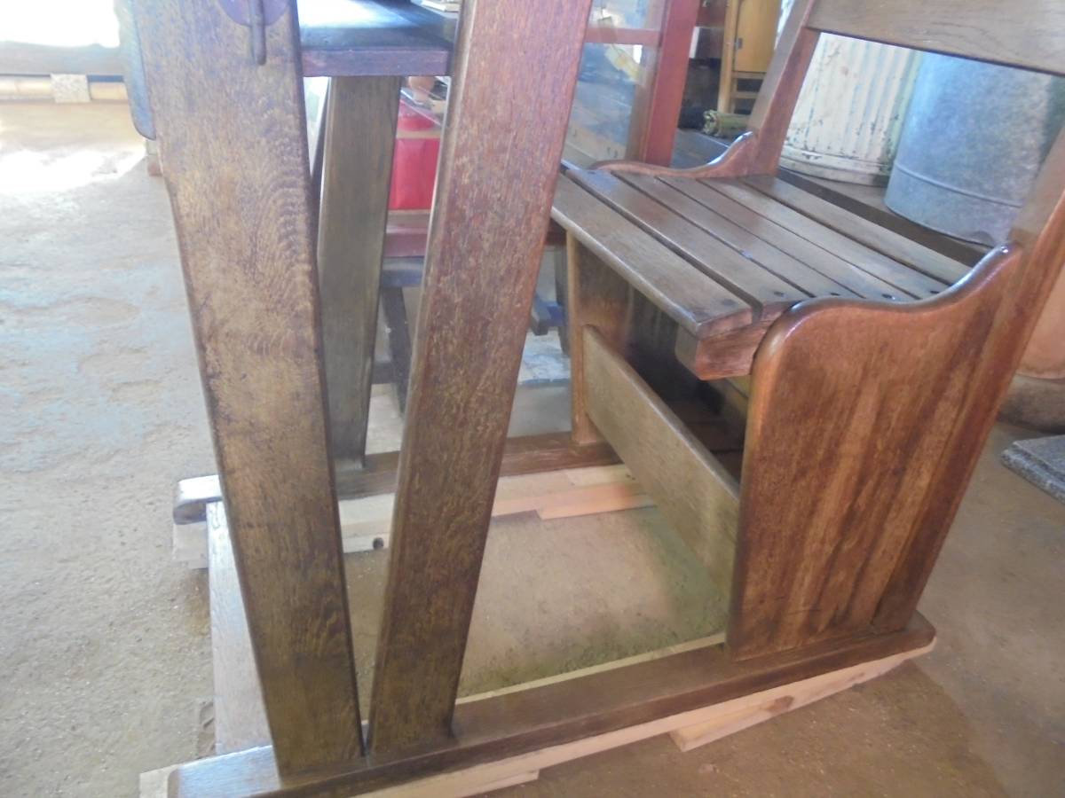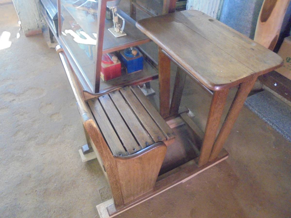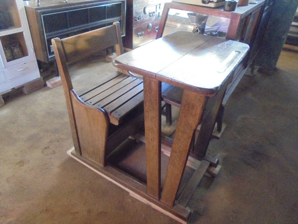 古道具の市で見つけた古いデスク、椅子一体型の木製学習机です。