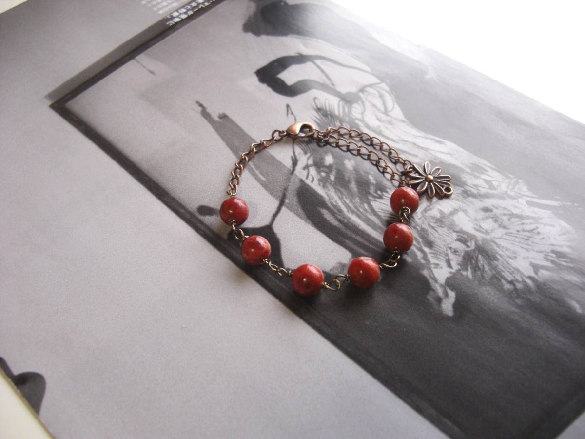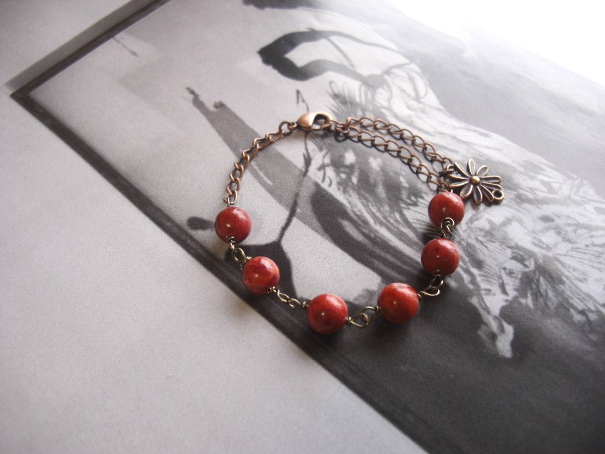 シックな秋色を繋げて・・シリーズです♪大人の赤・・深い赤のスポンジ珊瑚のブレスレットです♪シンプルなデザインは8ミリ位の丸玉 のスポンジ珊瑚をランダムに繋ぎました♪長さは全長23センチ位です♪お揃いのブレスレットやネックレスも出品しています♪シンプルで飽きの こないいつまでも着けられるデザインを考えて作り ました♪ハンドメイドをご理解頂いてノークレーム、ノーリターンでお願いします