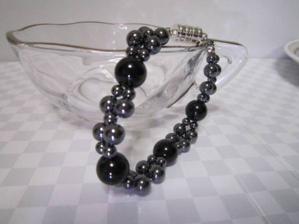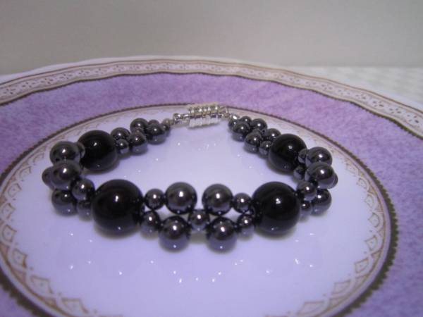 | ★★★ヘマタイト (terahertz) 3㎜玉・6㎜玉とオニキス1㎝玉の組み合わせです。★★★ ★★★ブレスレットの長さは約19㎝です。ブレスレットの留め金具の部分はマグネットで高級感溢れる商品です。★★★ ★★★すごくお洒落で綺麗なデザインの商品です。★★★ 【ヘマタイトとは】 ヘマタイトは和名で赤鉄鉱と呼ばれている通り、鉄鉱石のひとつです。密度が高く硬く結晶した酸化鉄で、鉄の含有量が約70パーセントを超えるもっとも重要な鉄鉱資源となっています。 ヘマタイトのなかでも光を反射するほど綺麗に結晶するものがあります。「鏡鉄鉱」といい、宝石として、大きく結晶したものなら彫刻の素材としても利用されます。 【ヘマタイトの意味】 ヘマタイトの語源は、ギリシャ語で「赤い血、血に似ている」を意味する「haimatitis」からきています。前述した通りヘマタイトは酸化鉄ですから粉は赤く、顔料としても利用されました。そのことから、血と生命力を象徴する石として考えられたようです。 また、人類の歴史に鉄器が現れると、戦争でも青銅に代わり鉄製の武器が作られました。血と武器と戦場という繋がりから、ヘマタイトが「戦いと勝利」という意味を持ったのも頷けます。 ヘマタイトは生命力と勝利を象徴し、戦いの守護石として古い歴史を持ったパワーストーンなのです。 【ヘマタイトの効果】 ヘマタイトは血液に力を与えることで、身体能力を高めてくれます。ヘマタイトは身に着ける人の血液に力を与えるエネルギーを持ちます。赤血球の働きを活性化し、全身への酸素供給量が高まることから、運動能力を高める効果や肉体労働をされている方には持久力を高める効果を持ちます。脳も活性されます。 ヘマタイトは直接血液に働きかけるストーンで、血液がドロドロで改善したい人、健康になりたい人におすすめです。血液がサラサラになるということは、健康であるための条件の一つでもありますから、体調もよくなります。持っておいて損はないパワーストーンです。 血液の流れがよくなると運動能力が高くなるのでスポーツマンや、日ごろ肉体労働をしている人には非常におすすめのアイテムです。また、体力を増加させる効果があるので、体力の無い人、病気がちの人にもおすすめです。体を動かさない人はヘマタイトを身に着けてウォーキングなどに行くとよいでしょう。ヘマタイトが体を動かし、筋力をつけるキッカケとなってくれるはずです。 【ヘマタイトのヒーリング効果】 〇意思を強くする (最後までやり遂げる意志の強さを得る) 〇生きることへの欲求を強める (生きる力を強める) 〇勝負のお守り (勝負運を高める) 〇健康増進 〇運動能力強化・向上 〇仕事運を高める 〇恋愛成就 〇過酷な運命を跳ね返す強さ (忍耐と根性、困難に立ち向かう勇気) 〇勝利へと導く (勝利と栄光を掴み取る) 〇血液に力を与える 〇判断力・決断力を高める 〇自立心・独立心の向上 〇魔除け厄除けのお守り 【ヘマタイトの体の症状への効果】 出血、炎症、生理不順、生理痛、貧血、冷え性、血液、鉄分の吸収、赤血球、腎臓、足のけいれん、眼の充血、循環器、解毒、肩こり、低血圧、めまい、手足のむくみ、電磁波の障害を吸収 ☆☆☆☆☆ヘマタイトの大きなエネルギー的特性として、持つ人の意思の力を強め、勝負強さを発揮する助けとなることがあげられます。 ヘマタイトをブレスレットやネックレス等として身に着けることで、脳の酸素活用をしやすくし、頭が冴えたり眠気を防いだりする効果もあるようです。 自分の意思を高める効果もありますから、これから本番を迎えるというときにも強い威力を発揮してくれます。緊張して本番では良い結果が出せなかった人、どうしてもこの試合や商談だけは外せないという人は、ぜひヘマタイトを身に着けてその効果を実感してください。 良い方向へ導いてくれるパワーストーンですから、勝負事が常にある人にもおすすめです。精神的にも強くしてくれるので、自分の判断力を高めてくれます。 過酷な運命やトレーニングに負けない精神的強さを養う石であり、経営者やスポーツ選手などにおすすめの石です。 ヘマタイトは心身ともに健康へと導いてくれる石ですので、もちろん一般の方にもおすすめの石です。☆☆☆☆☆ 【ヘマタイトのお手入れ (浄化方法)】 ヘマタイトの浄化法でもっとも気をつけるべきは水と塩です。 ヘマタイトの主成分は鉄ですから、塩分と水分はサビのもと。磨き上げた表面があれてしまいます。もし塩や水がついてしまったら、丁寧に拭き取っておきましょう。 同様にブレスレットやネックレスのようなヘマタイトのアクセサリーを身に着けた場合に、汗や脂がついたら必ずきれいで柔らかな布で拭いてください。 また、太陽光の場合は長時間出しておくとヘマタイトが非常に熱くなる可能性があります。熱を持つと表面の酸化が進みやすくなりますから、控えめに日光浴させることをおすすめし