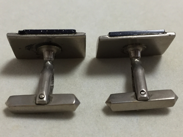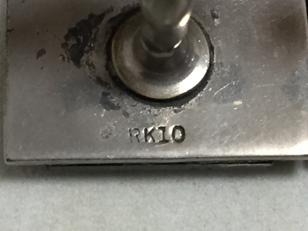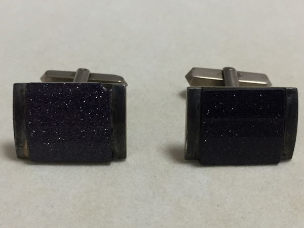 ゴールドストーンを使用した、スクエアデザインのカフスです。RK10の刻印があります。片方の金属部分の横軸に若干のぐらつきがありますが、使用上は問題ありません。