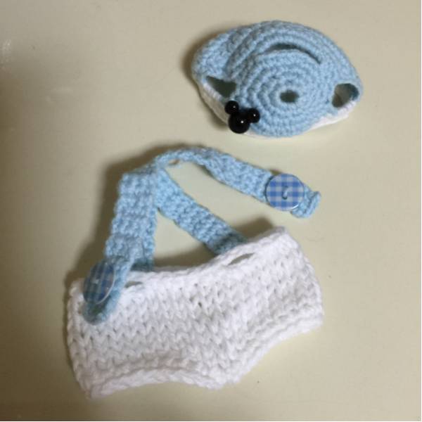 手編みで丁寧に編んでおります。 出品は耳出る帽子&サスペンダー風パンツのセットです。帽子のトップの開口にチェーンを通して少し引っ張って下さい。。安全ピンを通す開口もありますから安全ピンを通して下さい。手編みの帽子ですから、耳の納まり方や、頭の納まり方がご不安な方はご遠慮下さい。