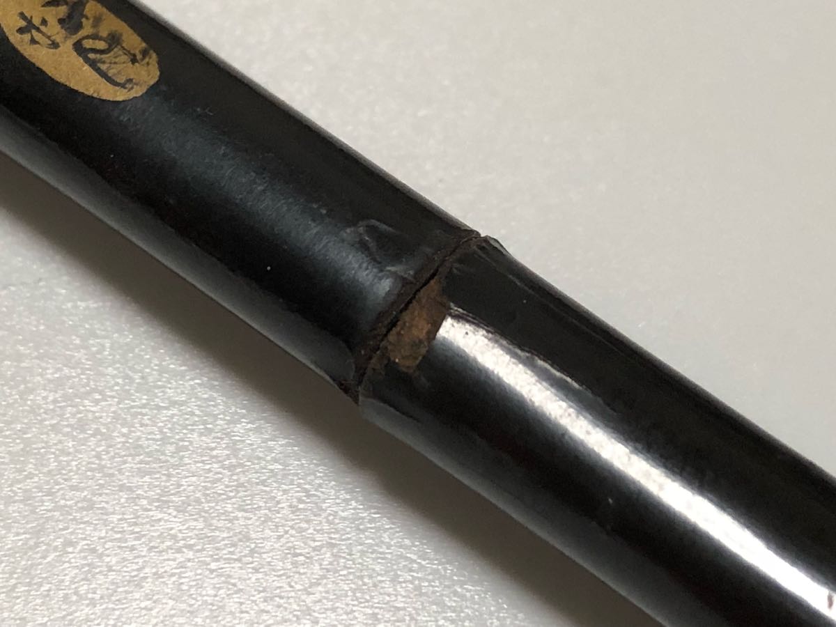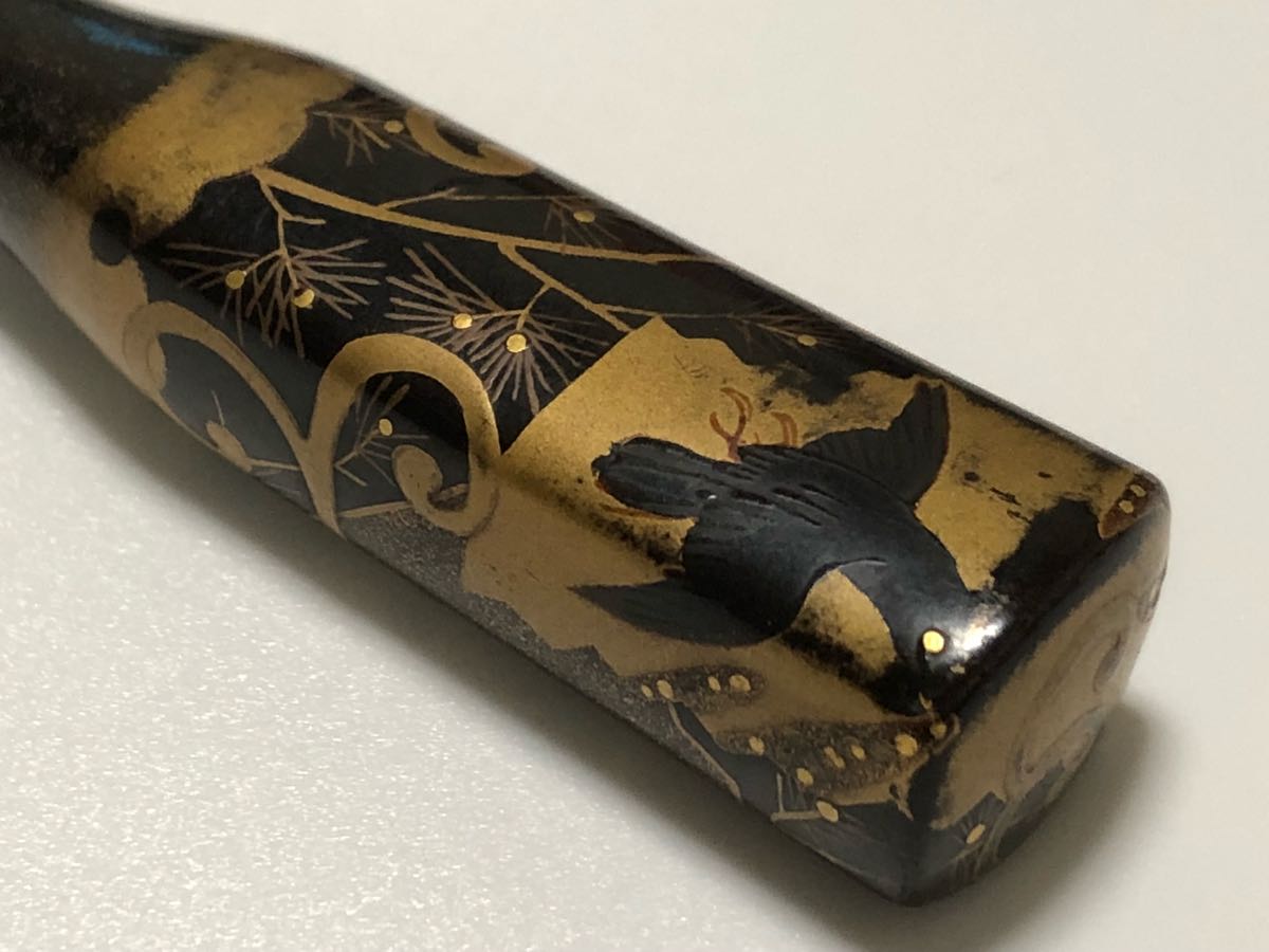 アンティークの木製漆塗りに金蒔絵を施した、扇千鳥文の笄です。作者、松月の銘があります。一部、漆の剥がれがあります。