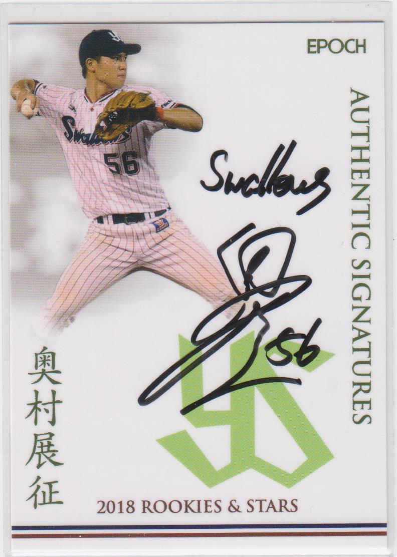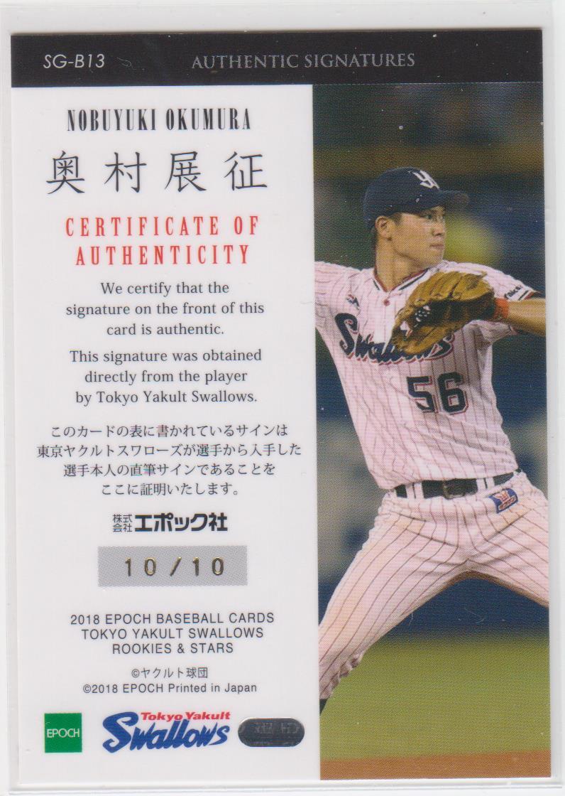 エポック社のROOKIES&STARSのパックから出る縦版の直筆サインカードで10枚のシリアルナンバーが入っています。シリアルナンバーは10/10のラストナンバーです。他のサインとは違いSwallowsと書かれたレアサインです。