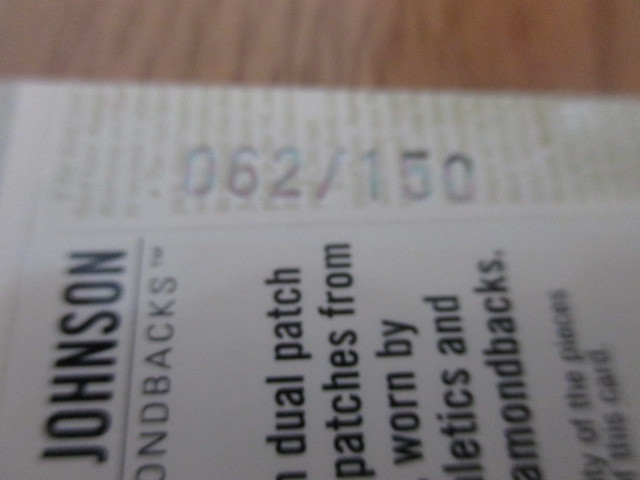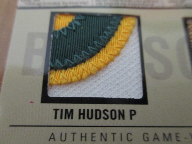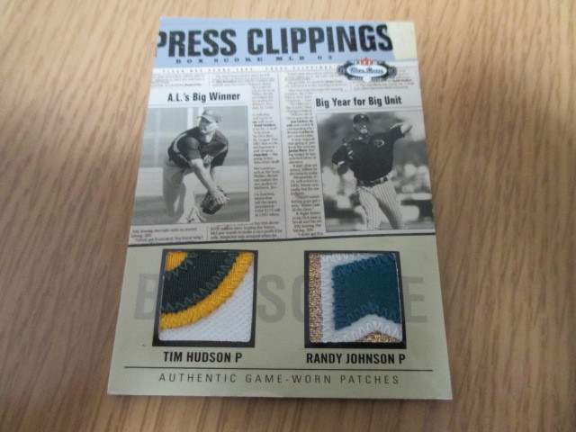 サイヤング賞5回のランディージョンソンと最多勝1回、オールスター4回、イチローの好敵手ティム・ハドソンのWパッチカードです。パッチはジョンソンはダイアモンドバックス時代のものでハドソンは20勝&最多勝達成したアスレチック時代のものです。ともに実際の試合で使用したユニフォームのパッチ部分の一片がインサートされたカードです。シリアルナンバー062/150。カードはFLEER社より販売されたものです。
