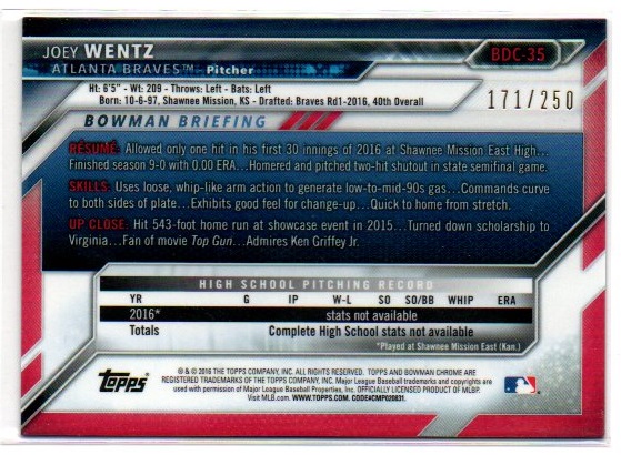 【JOEY WENTZ】2016 Bowman Chrome Draft Purple Refractors #BDC35 171/250