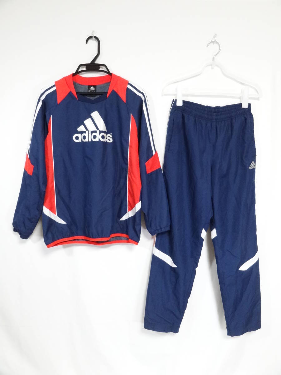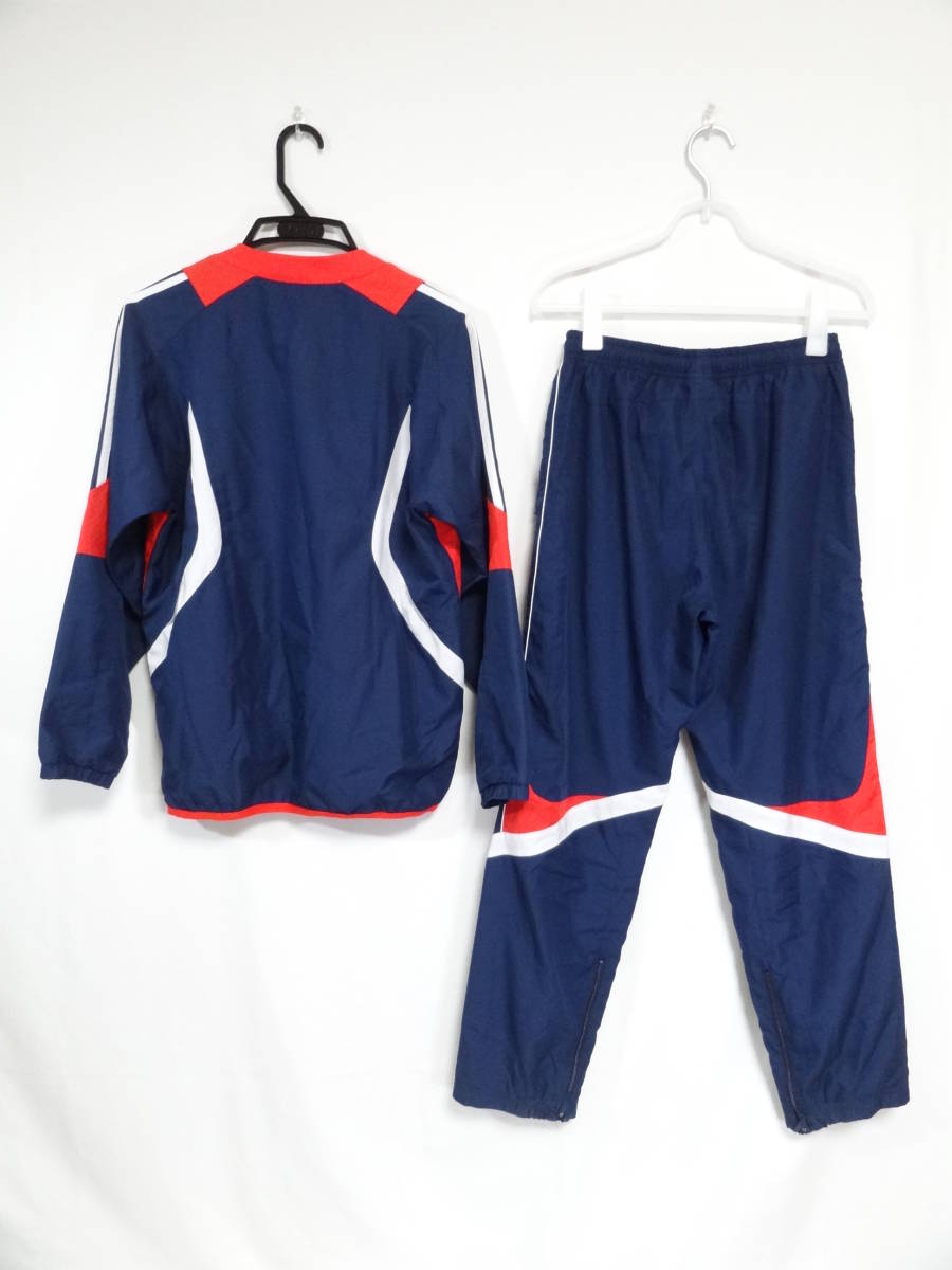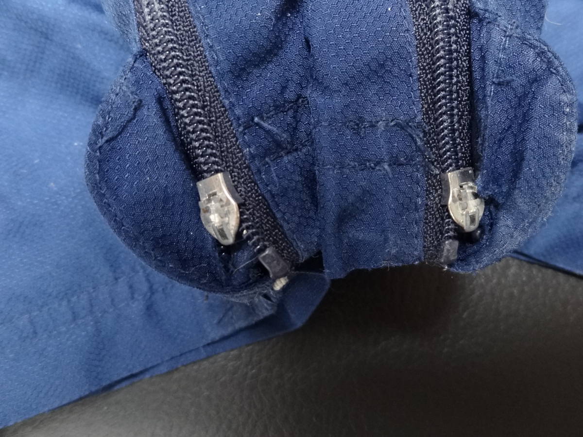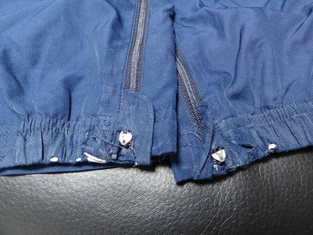 ジャケット 綺麗な状態です。 パンツ ウエストのゴムが伸びており、裾がのゴム部分に破れがあります。裾のファスナーの取っ手部分が両足ともしれてしまっており、ファスナーが動かし辛くなっています。ポケット付近にほつれもあります。 色はネイビーです。 上下ともにメッシュの裏地がついています。 ジャケット サイズ 160 着丈64cm 身幅52cm パンツ サイズ 160 総丈98cm ウエスト38cm (採寸の誤差はご容赦ください) |