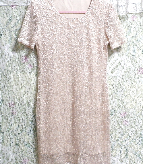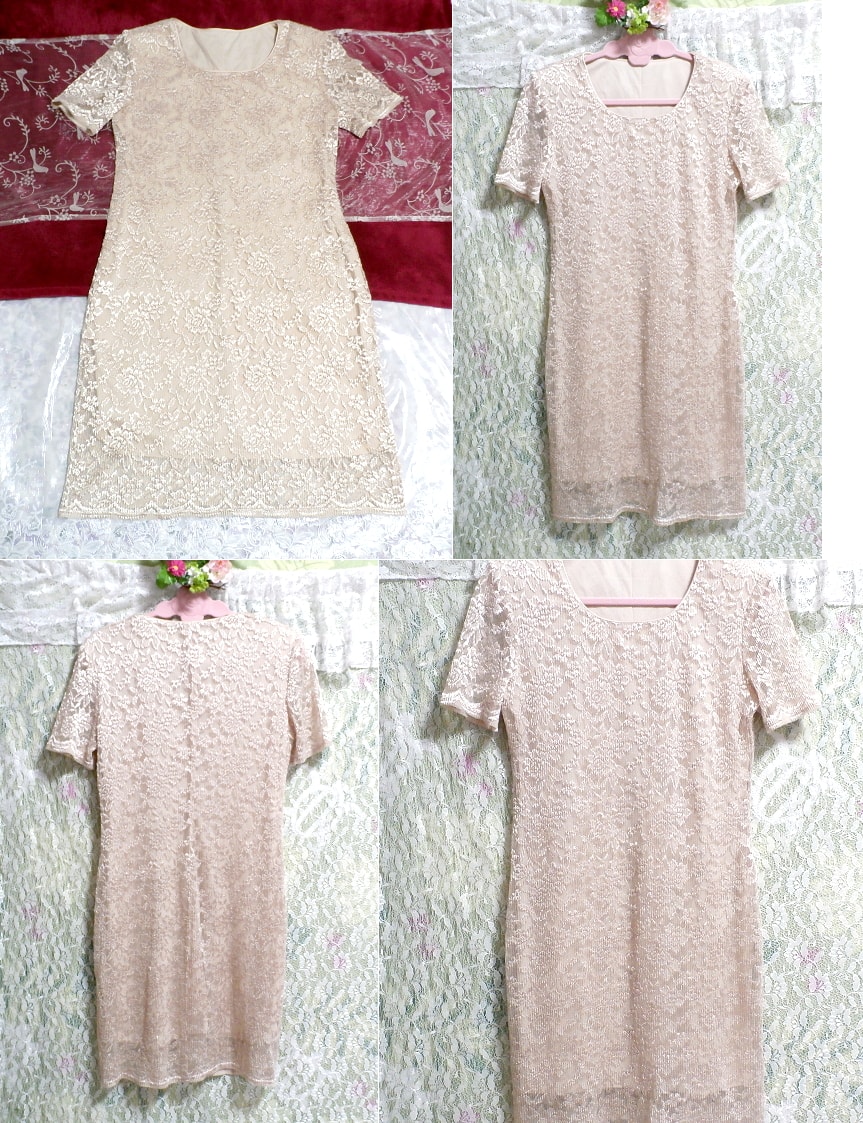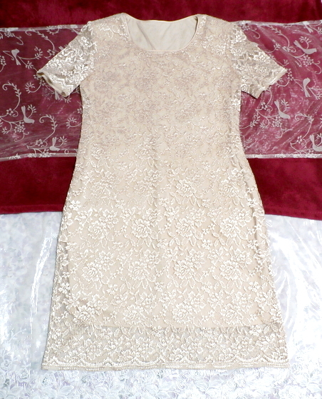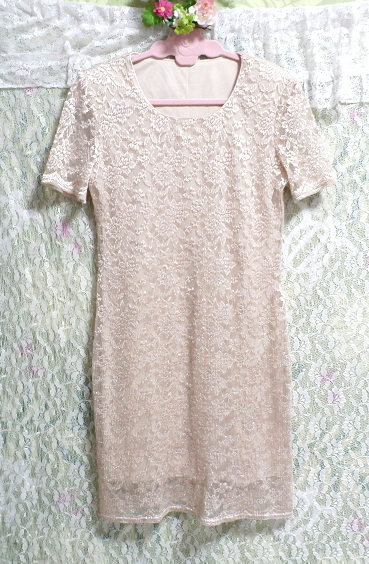 亜麻色花柄レース半袖ネグリジェチュニックワンピース Flax color flower pattern lace short sleeve negligee tunic dress