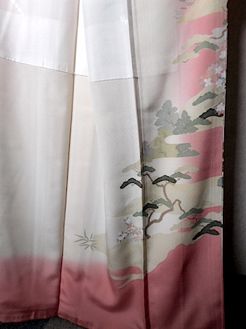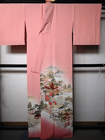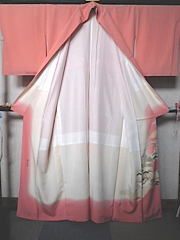 1580)色留袖 身丈160, 袖丈49, 裄66, 前幅24,7 後巾30,5、紋=抱き茗荷