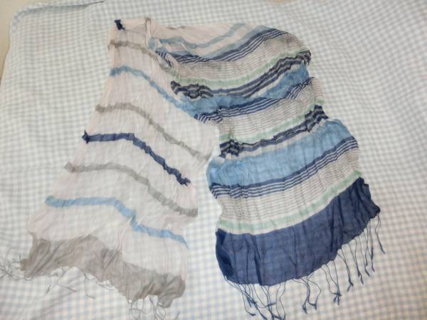 色は水色、青、白、パステルグリーンのボーダー 素材:タグなしで不明ですが、たぶんポリエステル100%(さらっとした触感です。) サイズ:200cm(このうちフリンジが20cm)×62cm 他にも洋服、バッグ、靴、小物、本を出品していますので見てください。時期によって、急な仕事の出張や病気などにより、取引ナビの連絡が2~3日遅れる場合があります。そのような場合には必ず自己紹介欄に期日等の説明を記載しておきますので、お急ぎの場合は入札前に、あるいは落札後、しばらくしても連絡が来ない場合には自己紹介欄をご覧ください。(自己紹介欄は画面右側の出品者情報欄の出品者名の隣()内をクリックすると見られます。