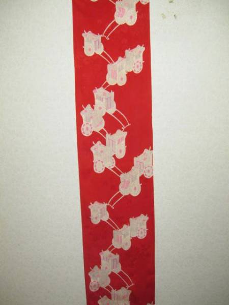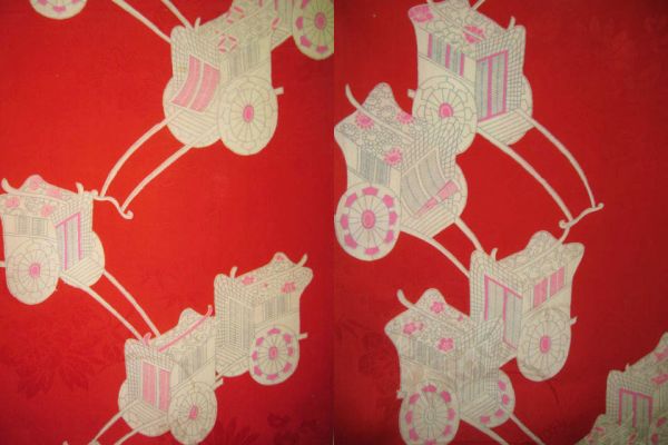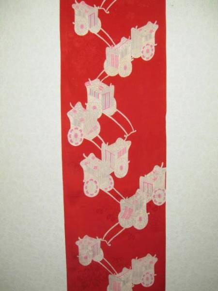 古布綾86★赤地*御所車*椿*梅*立花*綸子*襦袢*古布はぎれ★