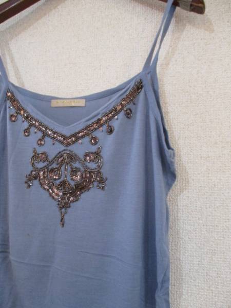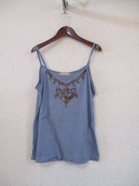 | 商品紹介 | 胸元のブロンズのスパンコールの飾り模様がオシャレなキャミソールです。 本体はブルーグレーの落ち着いた色合いです。 《素材》 レーヨン100% |