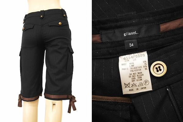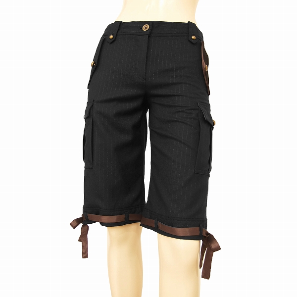 QT新品同様★ジラソール*gilasoL.★黒★ラメピンストライプ★サテンリボン★ハーフ丈★美脚カーゴパンツ★34号(SS)/レディース/夏