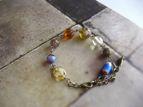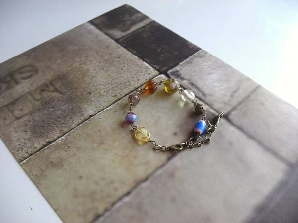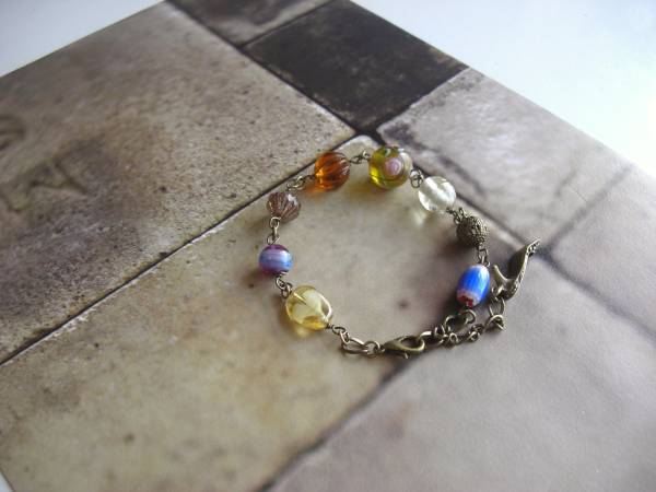 秋色・テキスタイル・・シリーズです♪オリエンタルに染まって・・アンティークビーズやトンボ玉、チェコビーズなどボヘミアンな雰囲気のブレスレットです ♪7ミリから12ミリ位までの丸玉やキューブやナツメなどデザイン違い、柄違いのビーズに透かし玉やメタルビーズを合わせて華やかな表情です♪長さは全長23センチ位で調節自由です♪お揃いのネックレスも出品しています♪シンプルで飽きのこないいつまでも着けられるデザインを考えて作りました!ハンドメイドをご理解頂いてノークレーム、ノーリ ターンでお願いします