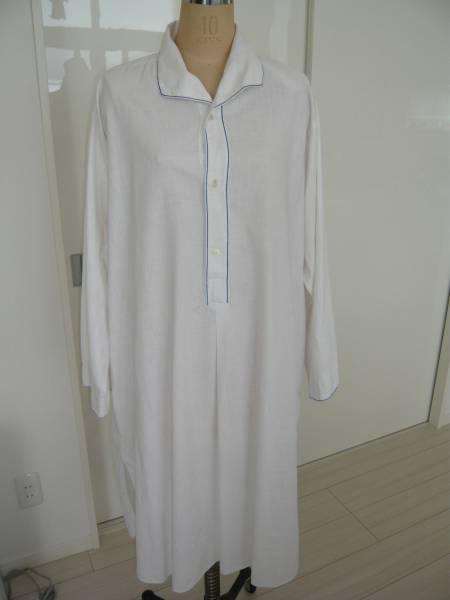 パリ購入、1950年代のヴィンテージ  コットン 100、 両脇にスリット有り、サイズ丈110、肩50、袖55、ポケットナシ,  襟 袖にブルーパイピング、ゆったり作られてますので男性用にも また 部屋着にもなります。