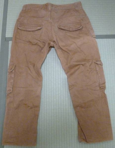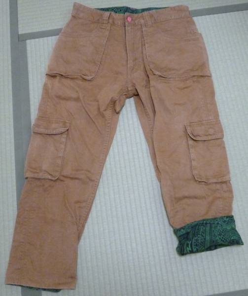 かなりデザイン性の高いパンツになり、黄土色のカーゴパンツをベースに裾を折り返していただくとグリーンのペイズリー柄になり、折って着用していただく感じがいいと思います。