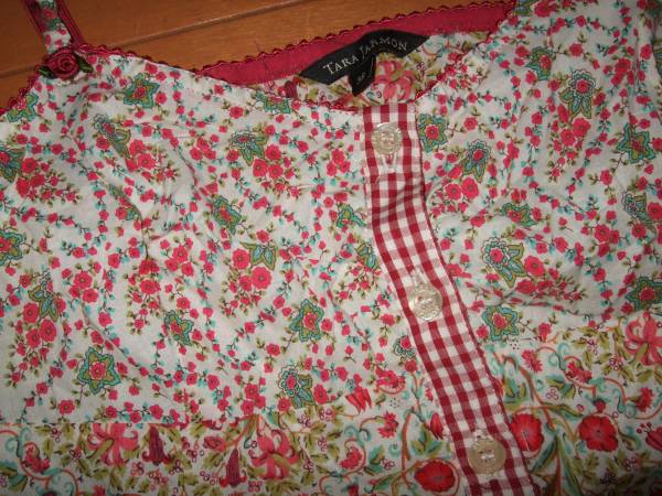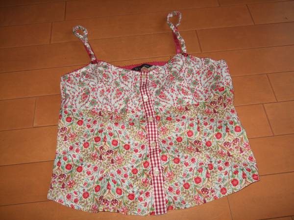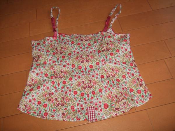 美品、タラジャーモンのキャミソールトップス、タラジャーモンらしい花柄を可憐に可愛く使った素敵なキャミソールトップスです。素材はカットソーではないシャツ生地のようなタイプのコットン100、フランス製ですが日本の代理店扱いの安心なお品です。表示サイズは38です。重ね着にしたり、ハイウエストのボトムスと合わせたり色々着こなしも楽しんでいただけます。肩より丈は約45、身幅約39です。肩ひもは一部ゴム入りですので、伸縮もします。ぜひご検討ください。