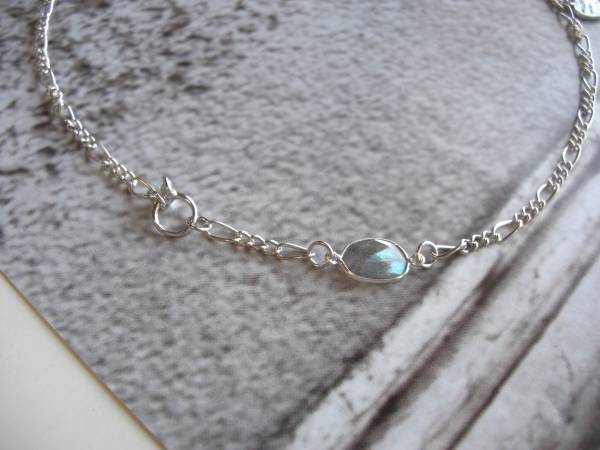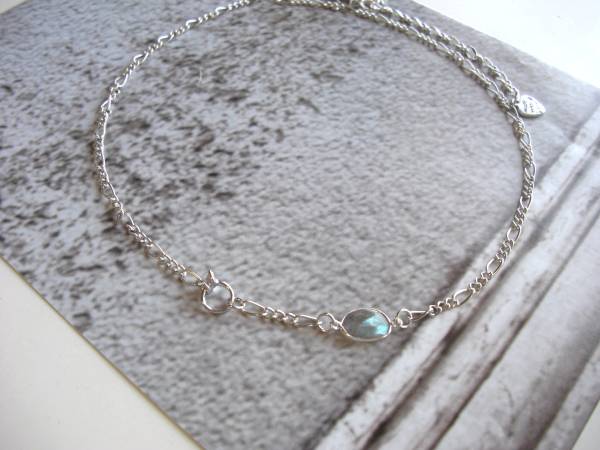ロマンチックを紡いで・・シリーズです♪一粒の宝石・・神秘的なラブラドライトのネックレスです♪ワイヤーフレームでデザイン したラブラドライトにジルコニアのベビーリング を合わせて可憐な表情です♪ラブラドライトは10×8ミリ位です♪ネックレスの全長62センチ位で調節自由です♪チョーカー風に着けられても素敵です♪お揃いのブレスレットも出品しています♪シンプルで飽きのこないいつまでも着けられるデザインを考えて作りま した!ハンドメイドをご理解頂いてノークレーム、 ノーリターンでお願いします