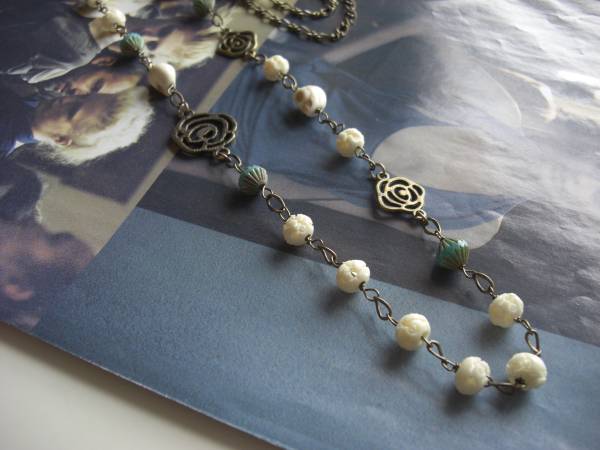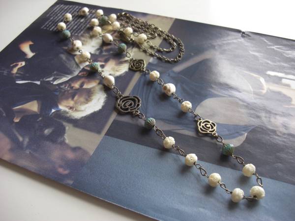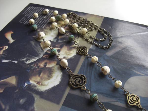 ルーズ・シルエット・・シリーズです♪髑髏さんと薔薇・・キュートな透かしボーンに薔薇のチャームや髑髏さんやチェコビーズを合わせてスタイリッシュなネックレスです♪8ミリ位の透かしボーンに10ミリ位のボーンの髑髏さんやチェコのデザインビーズや薔薇のチャームを合わせました♪長さは全長112センチ位で調節自由です♪2連にされても素敵です♪お揃いのブレスレットも出品しています♪ シンプルで飽きのこないいつまでも着けられるデザインを考えて作りました!ハンドメイドをご理解頂いてノークレーム、ノーリターンでお願いします