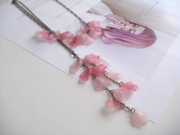 甘さと危うさと・・シリーズです♪花びらを集めて・・淡いピンク、大人っぽいサーモンピンクや濃いピンクなど表情の違うアクリルの花びらのネックレスの2点セットです♪短いタイプと長いタイプのデザイン違いです♪それぞれ華奢なチェーンで紡いでやさしい表情です♪花びらは12ミリ位です♪真ん中の短いネックレスは全長66センチ位で調節自由です♪右側の長いタイプは全長95センチ位で調節自由です♪トップは10センチ位です♪それぞれ単品やお揃いのブレスレットやピアスも出品しています♪♪シンプルで飽きのこないいつまでも着けられるデザインを考えて 作りました!ハンドメイドをご理解頂いてノークレーム、ノーリターンでお願いします