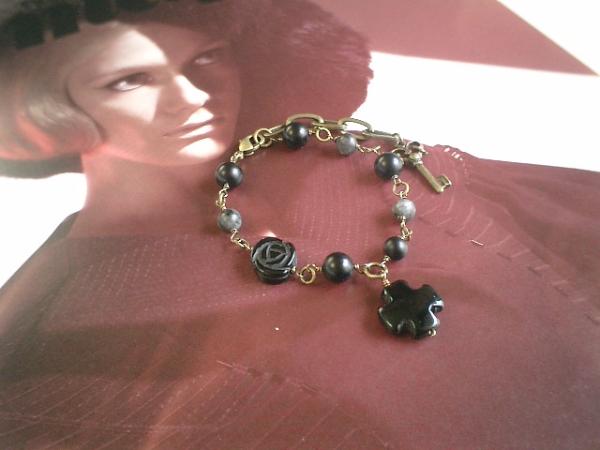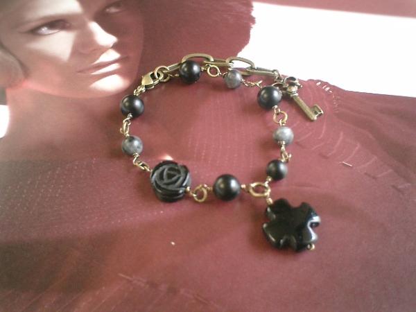 巴里・マチルダシリーズです♪ロマンチックを見つけて!シックなオニキスと薔薇とクロスのブレスレットです!さりげなく華やかな素材を合わせてパンクっぽい雰囲気です♪巴里の裏町をイメージして作りました♪オニキスは8ミリ、6ミリの丸玉と12ミリ位の両面薔薇です♪6ミリのラブラドライトを合わせて繊細な表情です♪トップのクロスは15ミリです♪デザインチェーンを合わせてアンティークモダンなデザインです♪長さは全長22センチ位で調節自由です♪トップは2・2センチ位です♪シンプルで飽きのこないいつまでも着けられるデザインを考えて作りました!お揃いのネックレスも出品しています♪ハンドメイドをご理解頂いてノークレーム、ノーリターンでお願いします