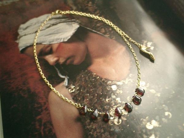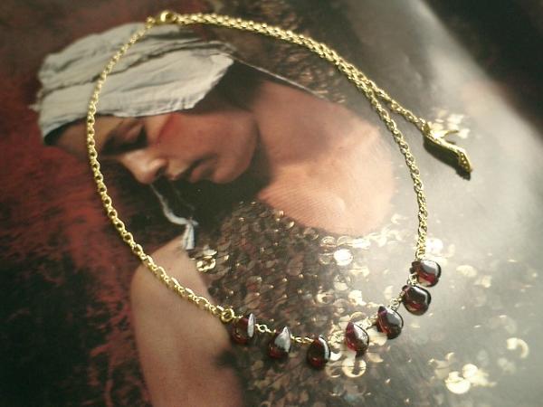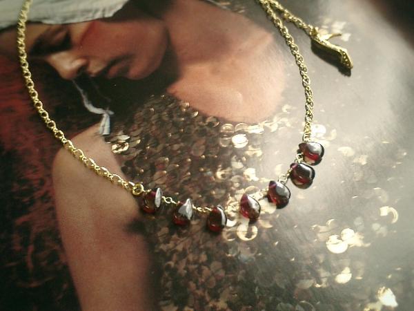 巴里・マチルダシリーズです♪ロマンチックを見つけて!可憐なガーネットのネックレスです♪繊細でアンティークな表情で作りました♪ガーネットは6×8ミリ位のフラットドロップです♪シックなゴールドのチェーンと合わせてひっそり華やかです♪長さは全長56センチ位で調節自由です♪チョーカー風にしてもブレスにしても可愛いです♪♪巴里の裏町をイメージして作りました♪♪シンプルで飽きのこないいつまでも着けられるデザインを考えて作りました!ハンドメイドをご理解頂いてノークレーム、ノーリターンでお願いします