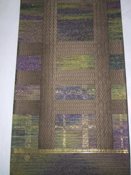 格調高い訪問着にどうぞ!帯です。おもに訪問着用帯です じゅらく 『。。。』ブランド 西陣六通柄帯(わな織り) 絹100%金属糸等使用   新品み仕立て品 村崎原草、緑などのモール地(格子は枯草系、裏地は黒、うす焦げ茶の段々