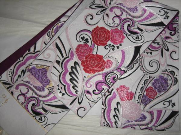 仕立てつき振袖用帯 西陣6通柄袋帯 白地(裏地は赤紫(小桜の地紋あり)) 絹87%その他13% 新品み仕立て品ですがこのお値段で仕立てつきで、納品です。なお、最終日まで待っていただかなくとも、入札した時点でオークションは終了し落札者となります。お値段的にもお安く設定いたしましたお買い得品です(西陣帯です)。もちろん芯込みの仕立て付きですが、仕立てなしの場合でも金額は変わりません。