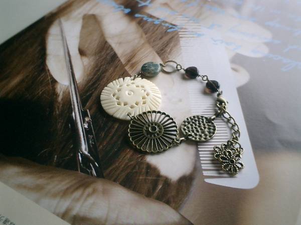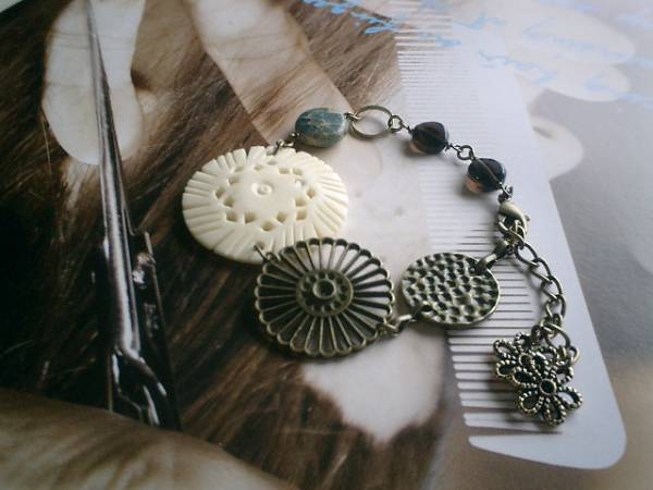巴里のお針子さん・・シリーズです♪アートな心象世界・・個性的な素材を集めたブレスレットです♪さりげなく初夏をイメージして作りました♪象牙色の彫りボーンは34ミリ位、ウェーブカットのスモーキークォーツは8ミリ位、夏色のグリーン模様のカオリンは12ミリのコイン、デザインチャームを集めてデザインチェーンでまとめました♪シックな大人の表情です♪長さは全長23センチ位で調節自由です♪お揃いのネックレスも出品しています♪シンプルで飽きのこないいつまでも着けられるデザインを考えて作りました!ハンドメイドをご理解頂いてノークレーム、ノーリターンでお願いします