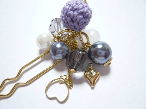 | 2個のハートのチャームと手編みのモチーフが可愛いです。 | ||