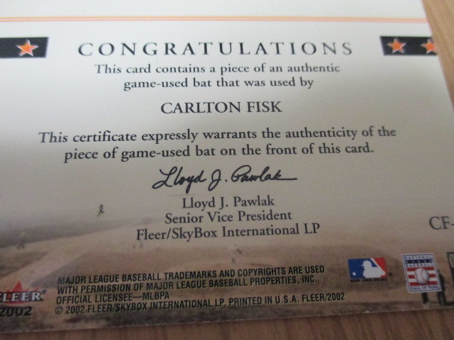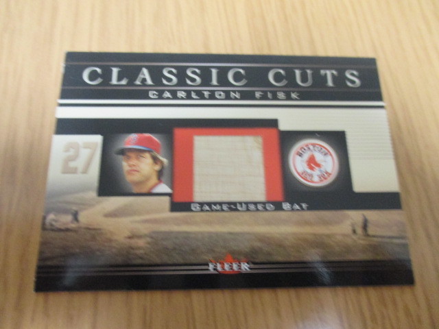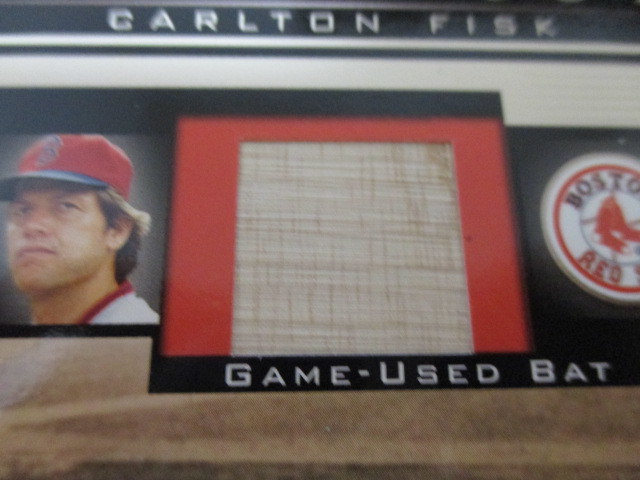 2000年野球殿堂入り。背番号27はレッドソックスの永久欠番。のボストン・レッドソックスレジェンド、カールトン・フィスク。通算2356安打、376本塁打、オールスター11回選出、なおフェンウェイパークの左翼ポールはワールドシリーズの試合の延長戦のレフトポール付近に飛んだフィスクの打球に対するジェスチャーから「フィスク・ファールポール」と名づけられてます。そのフィスクのMLBの試合で使用したバットの一部がインサートされたカードです。カードは2002年にフレアー社より発行されたものです。