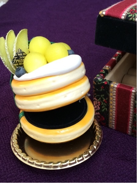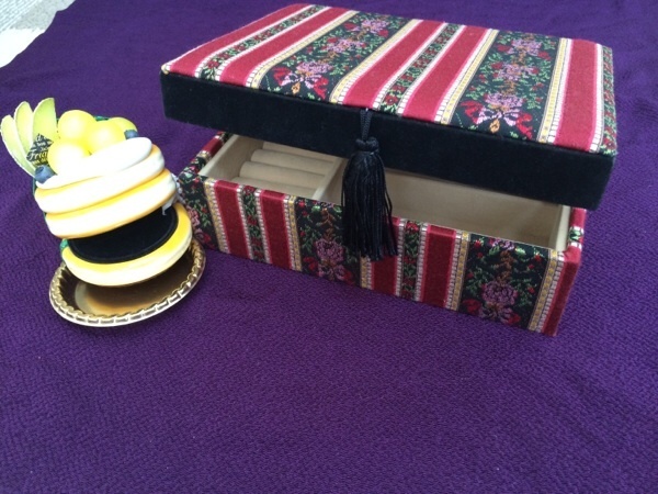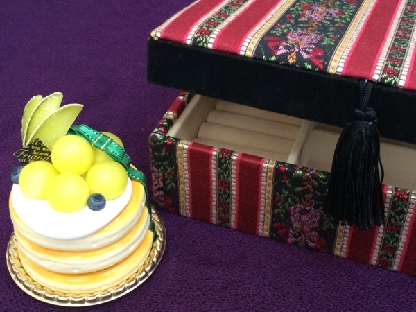 とても素敵な、ゴブラン織/別珍製ジュエリーボックス(約19×14×8cm)&スィ-ツ型リング入(単品用/径約6.5×8cm)で、未使用のお品です!新品ではありませんので、詳細はご了承ください!お気に召した方は是非いかがですか? 他にもいろいろと出品しておりますので、そちらもご覧ください! |