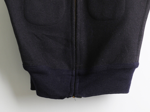 オハイオ州のHART MFG.CO 製、サイズ、コンディションも申し分ない一枚。 表記サイズ等は38、薄手のスウェットやニット、シャツの上からジャストで着れそうなサイズ感です。 素材は表記はありませんが、おそらくウールです。 カラーはボディはパープルとダークネイビーの中間色の様な色味、リブ部分はネイビーのツートン。 両胸にレザーパイピング仕様の両玉縁、ジップはピンロックのCONMARです。 シャツにキャスケットにスラックス等、ファッションに落とし込みやすく、且つグッドサイズ。おすすめです。 |