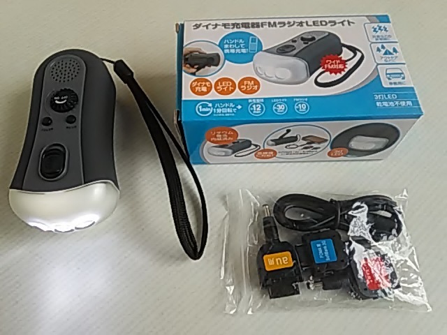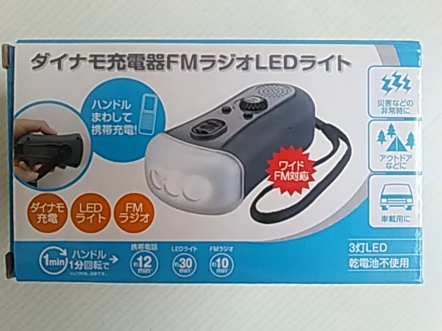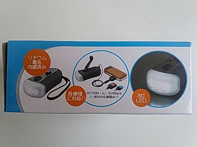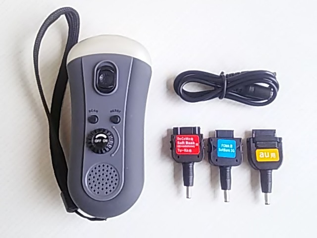 本品は、ダイナモ充電器FMラジオLEDライト★ハンドルまわして携帯充電 FOMA/au/SoftBank★災害などの非常時★アウトドア★車載用★動作確認★未使用です。