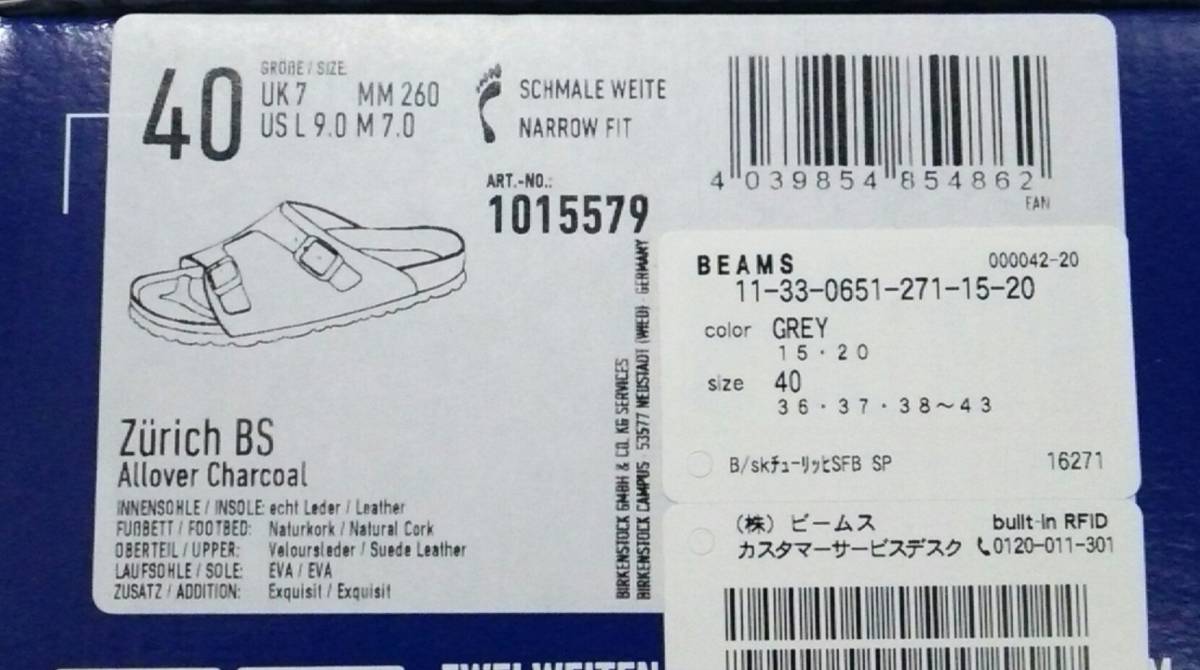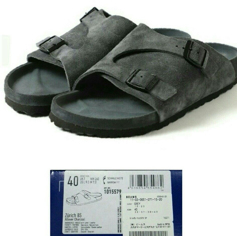 2019年5月発売!BEAMS別注の超限定アイテム、BIRKENSTOCK ZURICH!カラーはGREY、サイズは40。即完売の人気アイテムです!新品未使用ですので、是非ご検討ください!