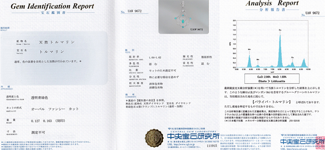 | 鑑別書に記載の分析報告書の数値(中央石のもの) | CuO(銅):2.96% MnO(マンガン):1.69% | |