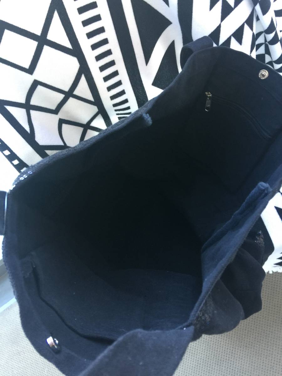 サイズ 約横39cm×高さ37cm 底のサイズ約16×40cm 持ち手約57cm 素人寸ですので参考にしてください。 マチもあり収納力抜群です。素材はコットン100% 内側にはファスナー付き 無しがそれぞれ1か所あります。 底板も入っていますのでしっかりしています。 店舗にて8900円で販売しております。お荷物の多い時やマザーNAGとして大人気です♪ スパンコールは性質上セーターなどにくっつきやすいのでお取り扱いにはお気を付けください。 | |||